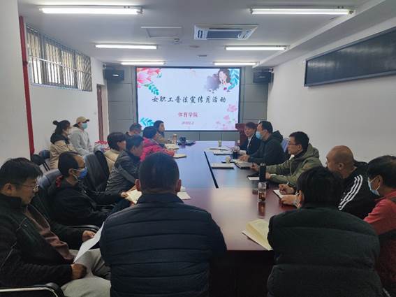 为深入学习宣传贯彻党的二十大精神,认真学习贯彻习近平法治思想,宣传贯彻新修订的《中华人民共和国妇女权益保障法》,推动男女平等基本国策贯彻落实,大力营造尊法学法守法用法的良好氛围,促进工作场所性别平等,按照按照新乡市总工会《关于开展2023年女职工普法宣传月活动的通知》文件精神和学校《庆祝2023三八国际妇女节系列活动方案》(校工字〔20231号)要求,体育学院工会委员会于313日上午,开展了以“学习宣传贯彻党的二十大精神,依法保障女职工合法权益和特殊利益”为主题的普法宣传活动,全体教职工参加座谈会,进行了集体学习和发言讨论。