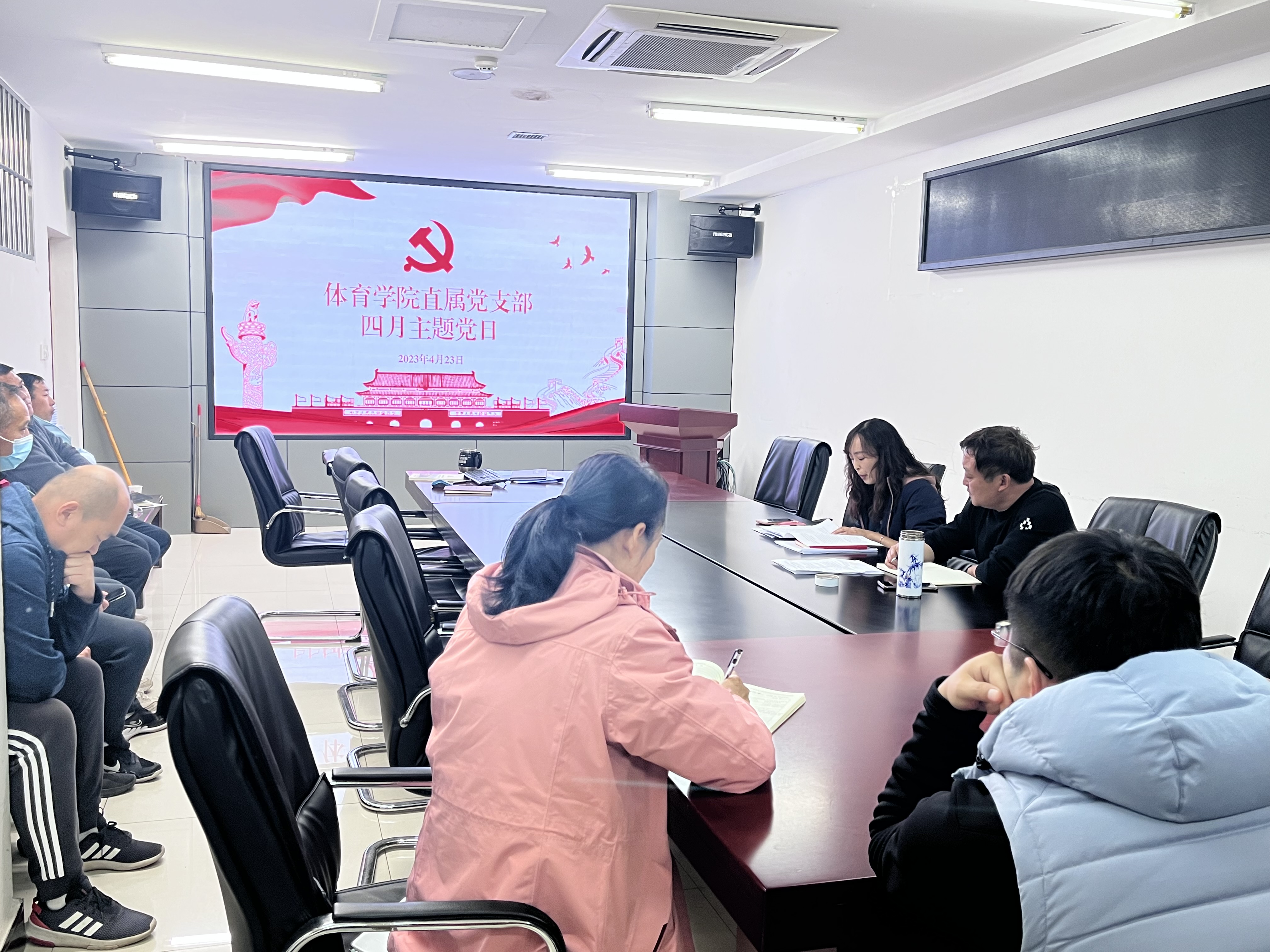 按照学校《关于开展2023年4月份支部主题党日活动的通知》要求,体育学院直属党支部于4月23日开展主题党日活动。直属党支部书记李轶、教学督导员赵东波、全体党员和入党积极分子参加活动。