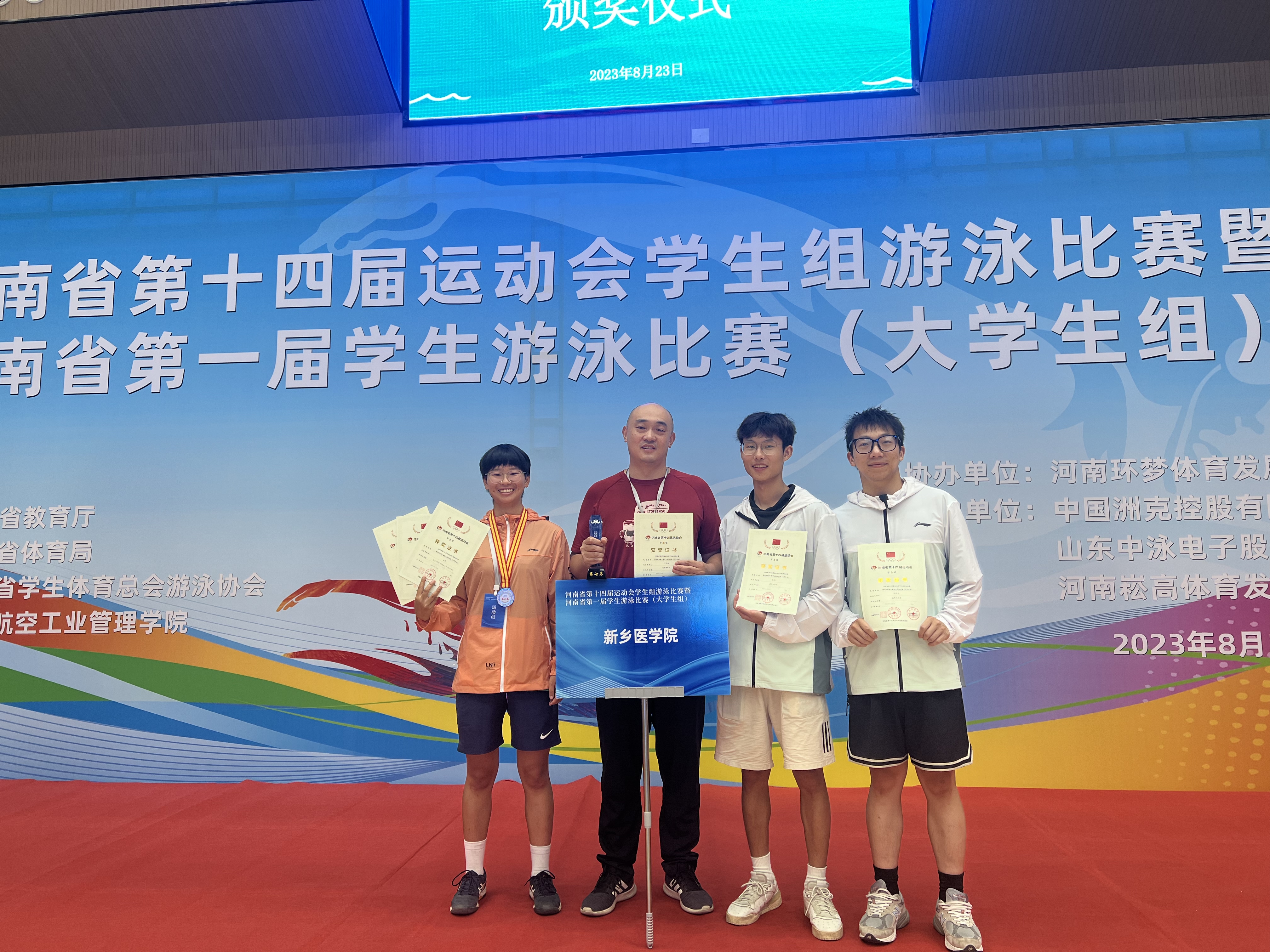 2023年8月23日, 河南省第十四届运动会学生组游泳比赛暨河南省第一届学生游泳比赛在郑州航空经济管理学院隆重启幕。共有来自全省17所高校的80名运动员参加。我校有3名学生运动员参加了比赛并取得优异成绩。