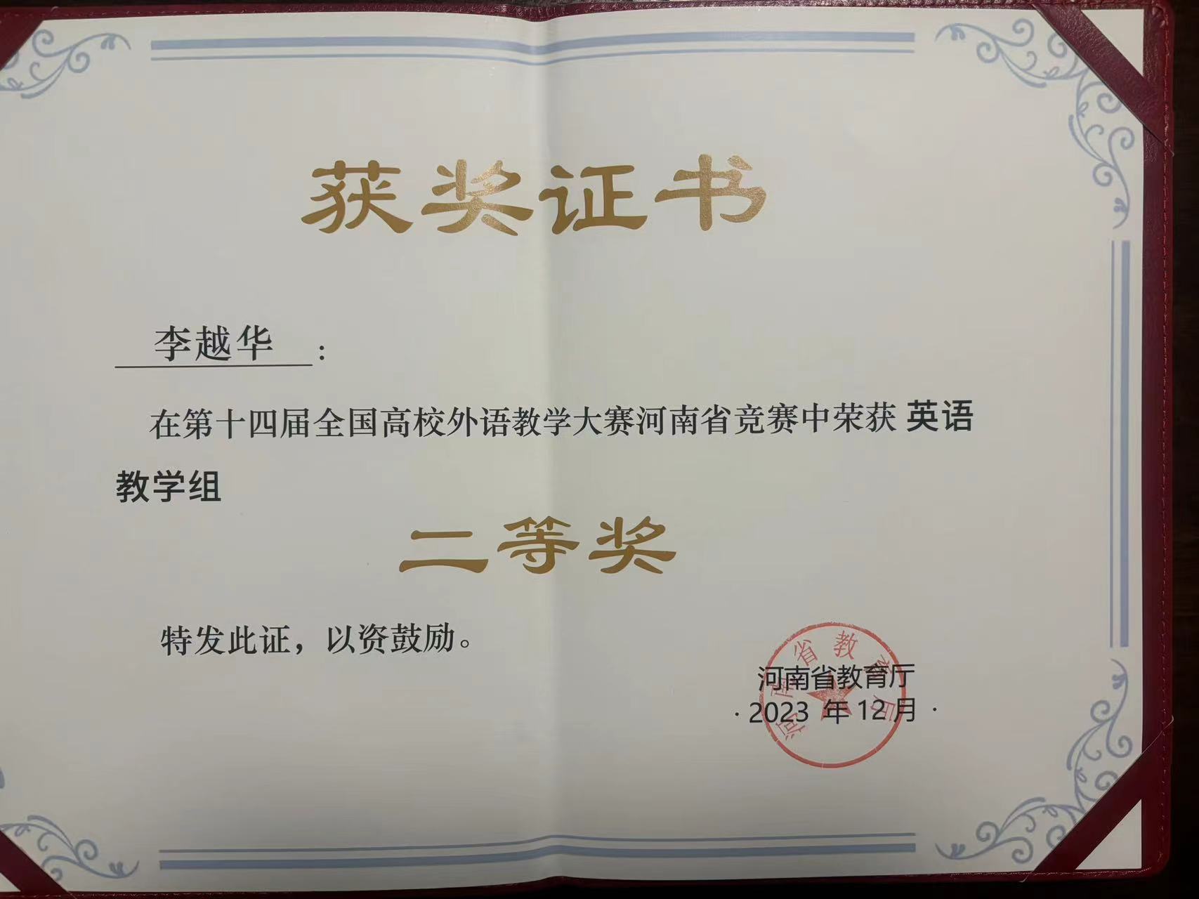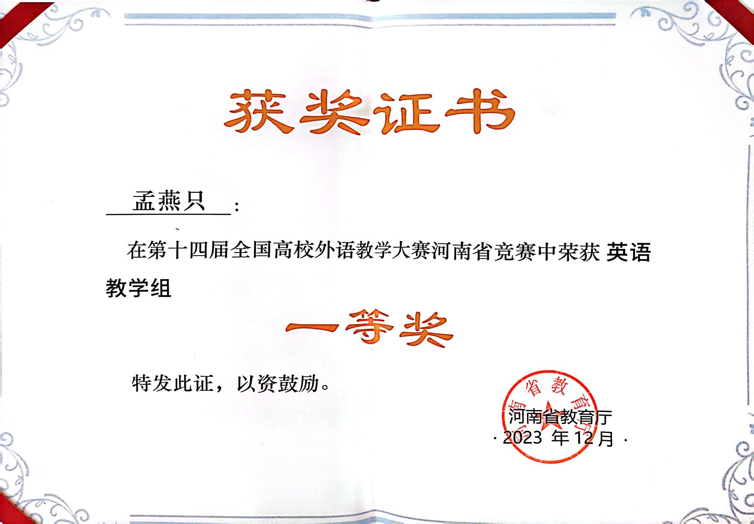 近日,河南省教育厅办公室公布了第十四届全国高校外语教学大赛河南赛区获奖名单,我校外语学院教师孟燕只荣获英语专业组一等奖,李越华荣获综合组二等奖。