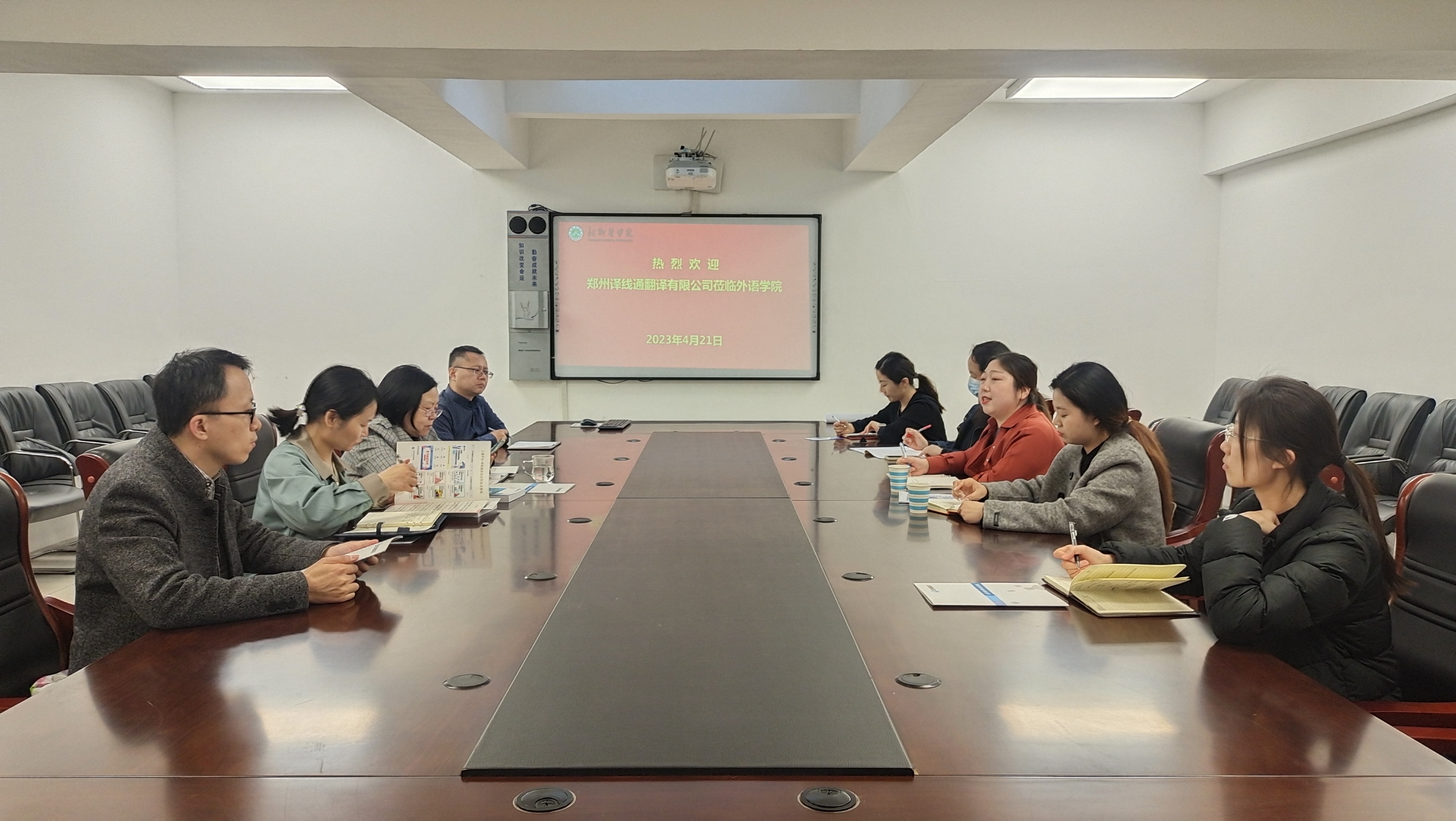 4月21日上午,外语学院与郑州译线通翻译有限公司在学院会议室举行校企合作洽谈会。任如意院长,李超英副书记,以及专业教研室相关教师出席会议。