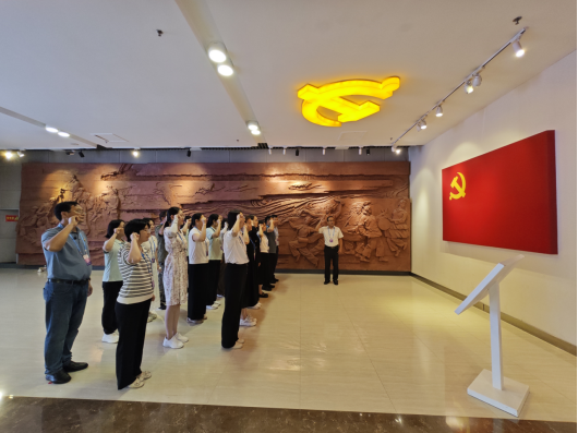 在宣誓墙前,党员干部们在党总支书记王鹏的带领下庄严宣誓,重温入党誓词。