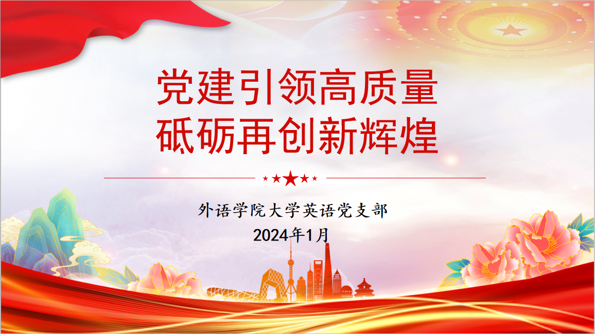 2024年1月10号下午15点 ,大学英语党支部在外语学院会议室进行了主题为《党建引领高质量,砥砺再创新辉煌》的主题党日活动。 党支部书记惠彩霞首先通报了到会情况,提出了这次活动的主要议程:一、观看国家主席习近平发表二〇二四年新年贺词;二、深入学习《中国共产党纪律处分条例》、国家主席习近平在中共中央政治局召开专题民主生活会强调巩固拓展主题教育成果为强国建设民族复兴伟业汇聚强大力量中共中央总书记会议的重要讲话; 三、每位党员对观看视频和学习材料谈心得、话体会。