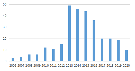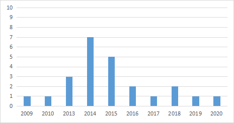 图2 2009-2020河南省本科翻译专业院校数量分布