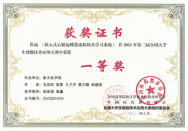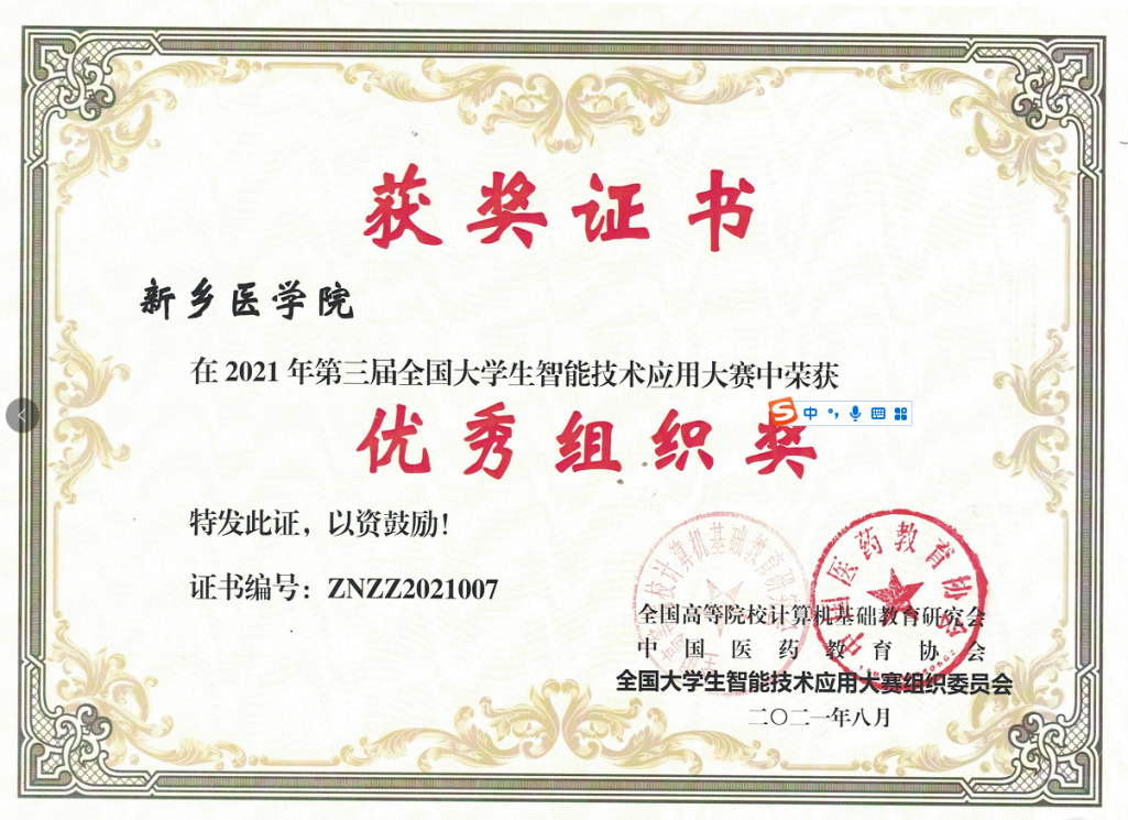 10月9日,由中国医药教育学会、全国高等院校计算机基础教育学会主办的“第四届全国智能医学高峰论坛暨2021年度学术会”在成都隆重召开。会上对第三届全国大学生智能技术应用大赛获奖高校师生颁奖,我校获得优秀组织奖、优秀指导教师奖、一等奖1项、二等奖1项、三等奖5项。医学工程学院研究生吴星阳、贾梦珠,护理学院研究生卢一代表我校研究生参加颁奖典礼。