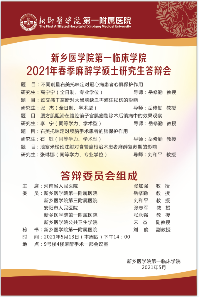 2021年上半年华亿在线手机版(大中国区)第一附属医院麻醉学硕士研究生答辩海报