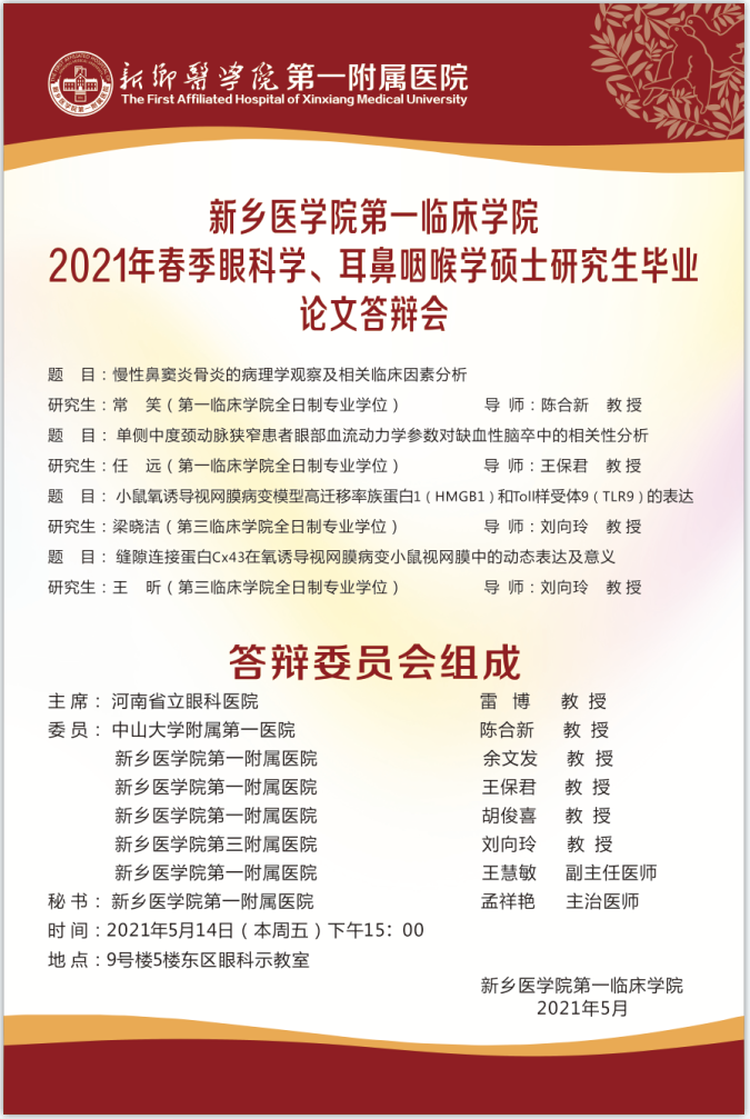 2021年上半年华亿在线手机版(大中国区)第一附属医院眼科学、耳鼻咽喉学硕士研究生答辩海报