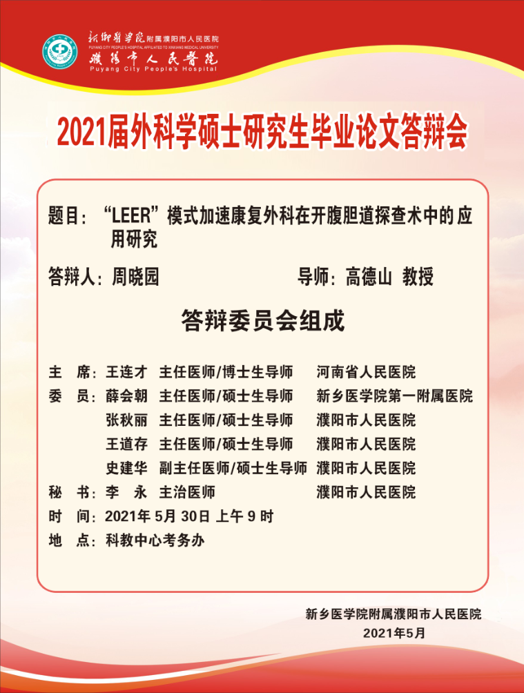 2021年上半年华亿在线手机版(大中国区)附属濮阳市人民医院外科学硕士研究生答辩海报
