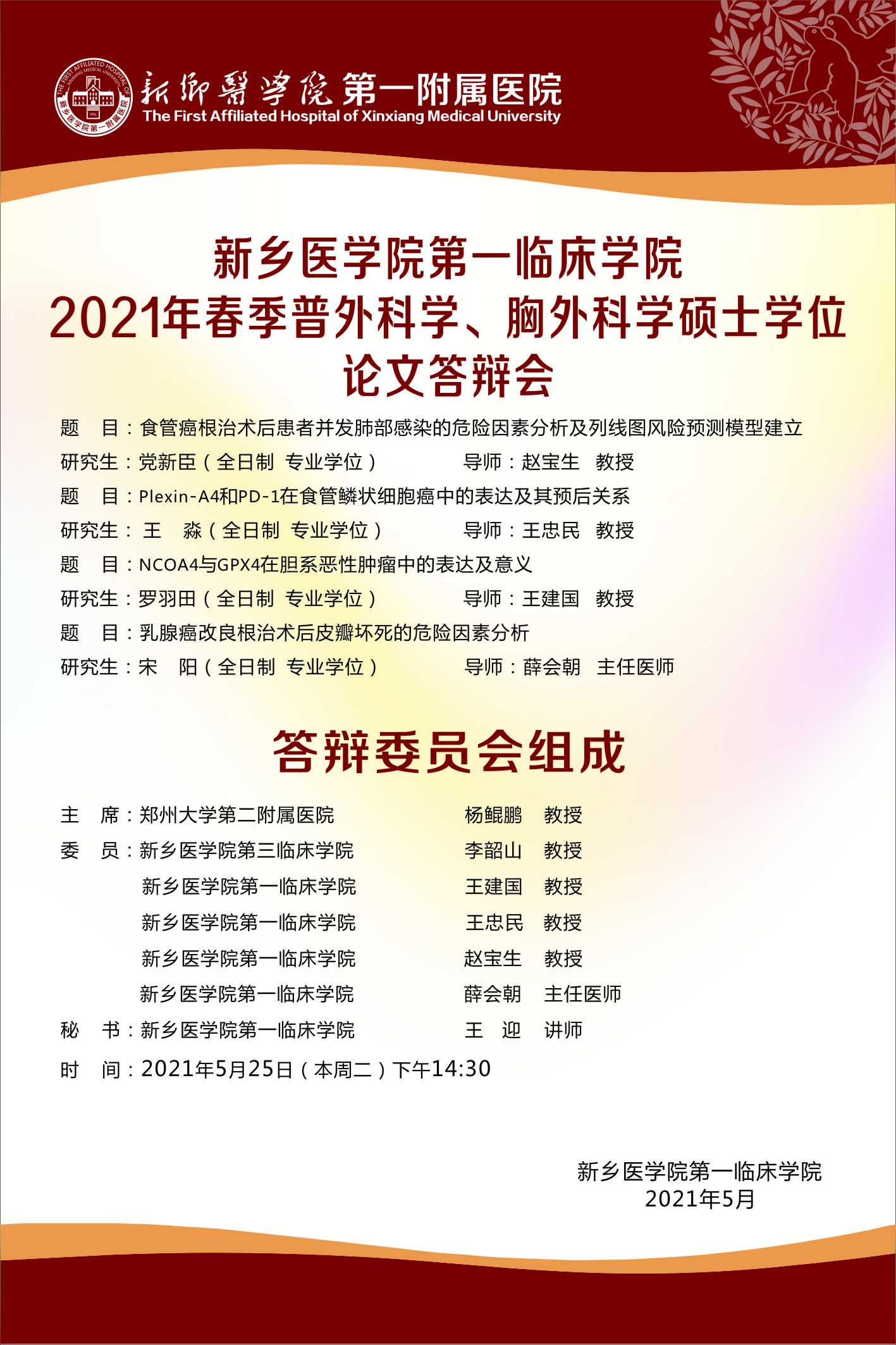 2021年上半年华亿在线手机版(大中国区)第一临床学院普外科学、胸外科学硕士研究生答辩海报