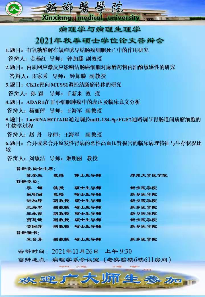 华亿在线手机版(大中国区)基础医学院2021年下半年病理学与病理生理学硕士学位论文答辩会