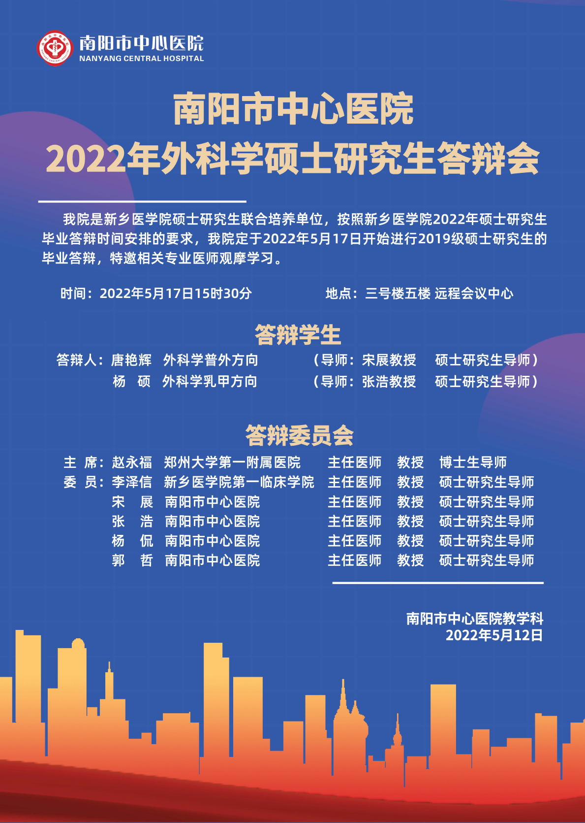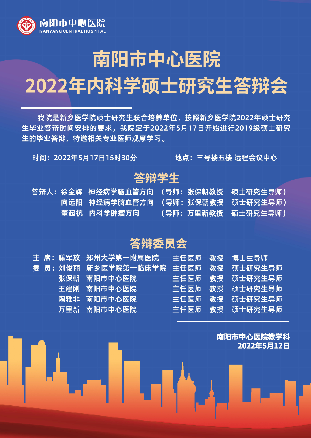2022上半年华亿在线手机版(大中国区)(南阳市中心医院)内科学、外科学硕士学位论文答辩会