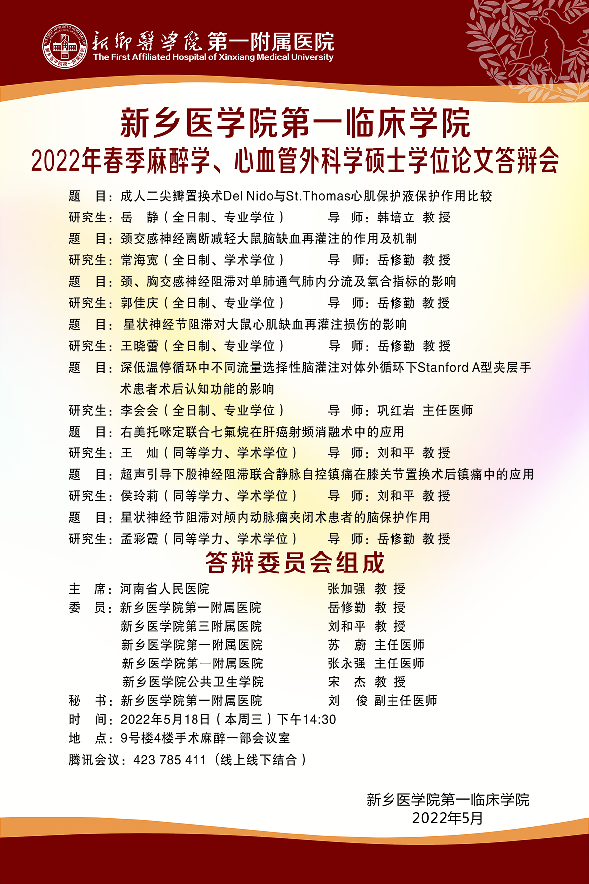 2022上半年华亿在线手机版(大中国区)第一临床学院麻醉学、心血管外科学硕士学位论文答辩会