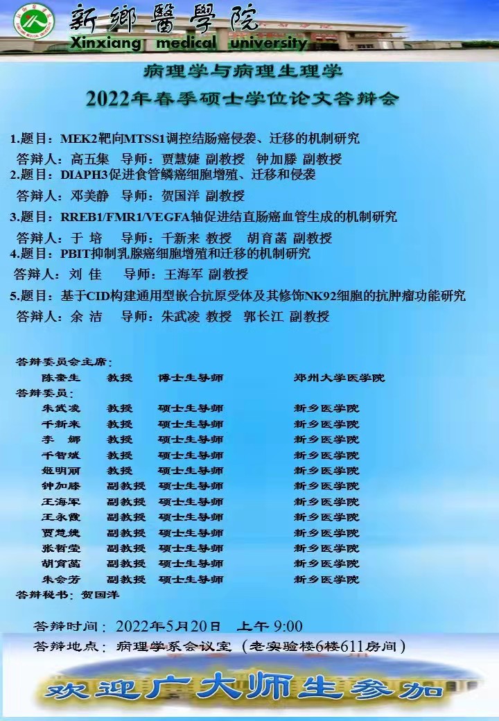 2022上半年华亿在线手机版(大中国区)基础医学院病理学与病理生理学硕士学位论文答辩会