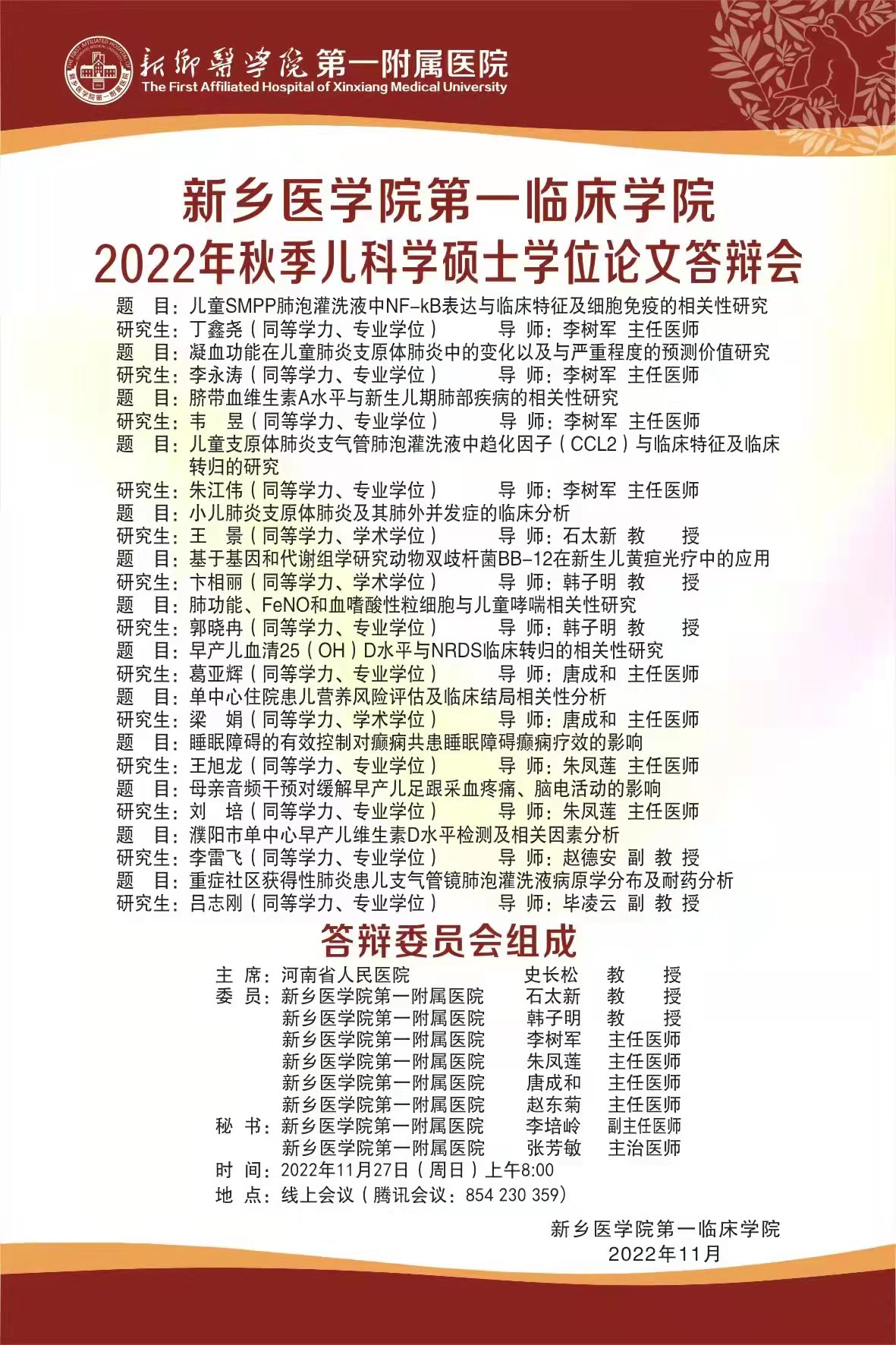 2022年秋季华亿在线手机版(大中国区)第一临床学院儿科学硕士论文答辩会
