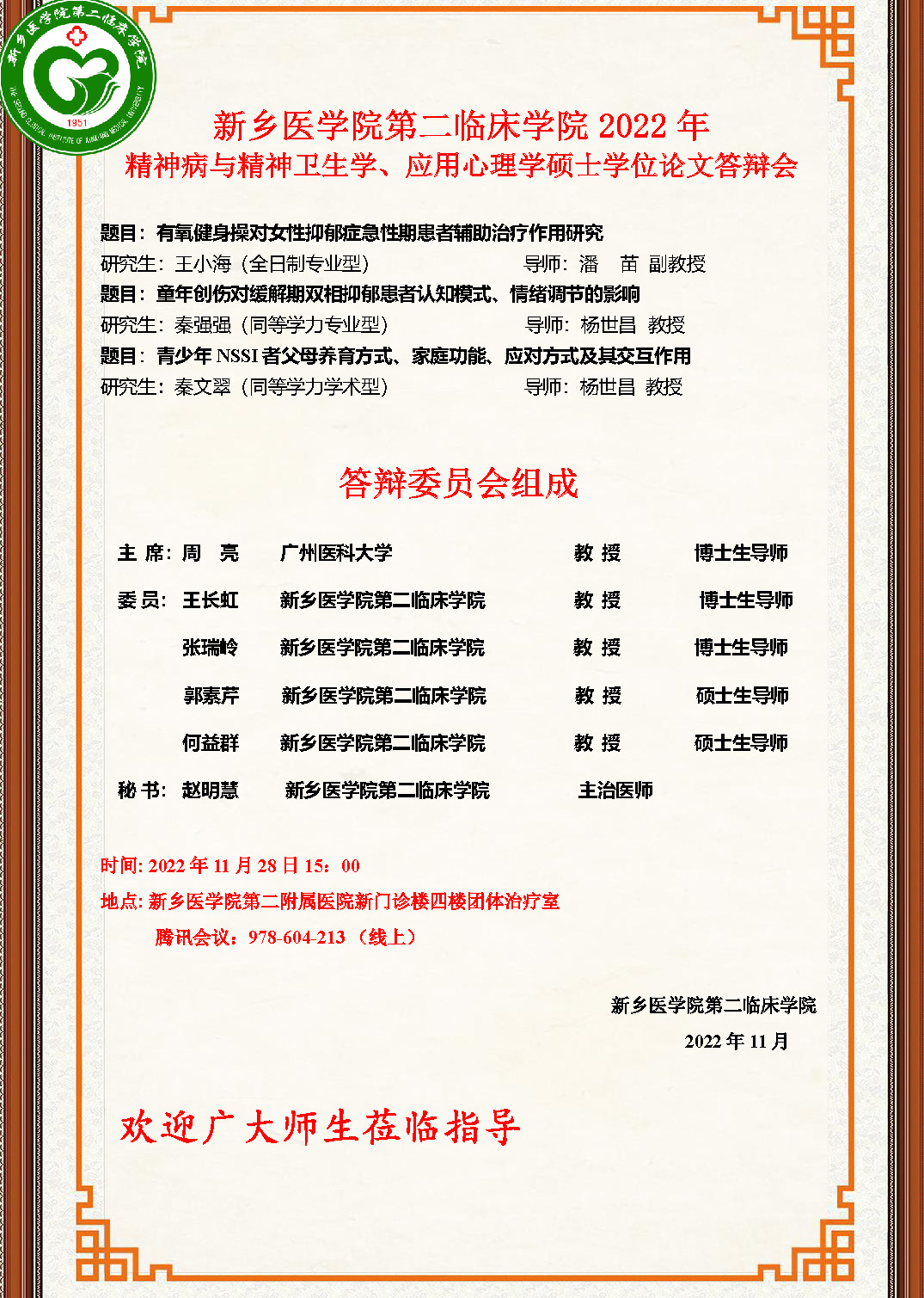 2022年秋季华亿在线手机版(大中国区)第二临床学院精神病与精神卫生学、应用心理学硕士论文答辩会