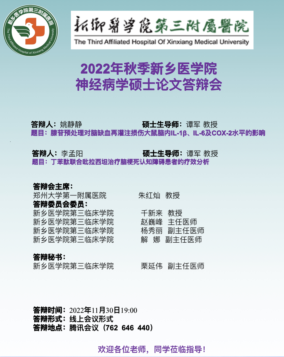 2022年秋季华亿在线手机版(大中国区)第三临床学院神经病学硕士论文答辩会