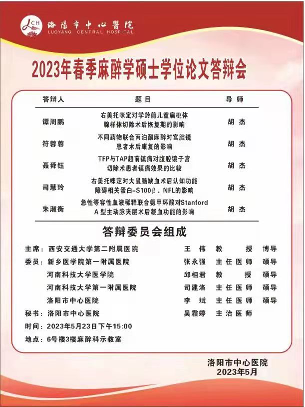 2023上半年华亿在线手机版(大中国区)(洛阳市中心医院)麻醉学硕士学位论文答辩会