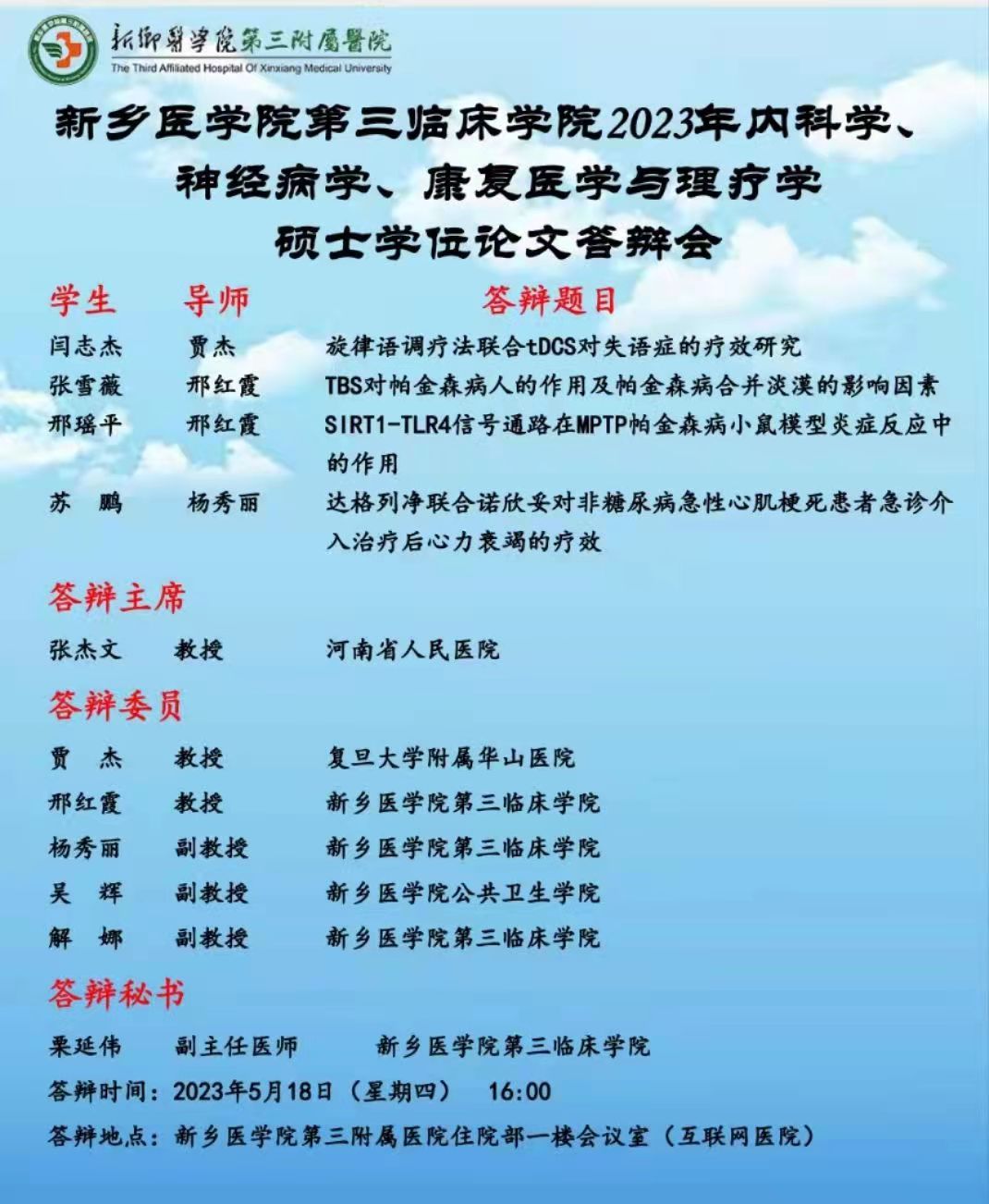 2023上半年华亿在线手机版(大中国区)第三临床学院内科学、神经病学、康复医学与理疗学硕士学位论文答辩会