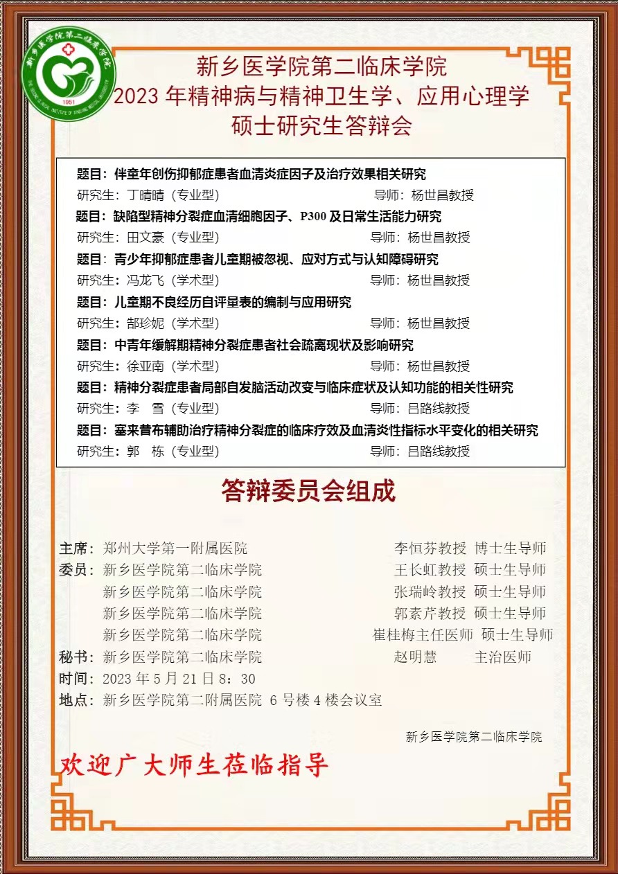 2023上半年华亿在线手机版(大中国区)第二临床学院精神病与精神卫生学、应用心理学硕士学位论文答辩会