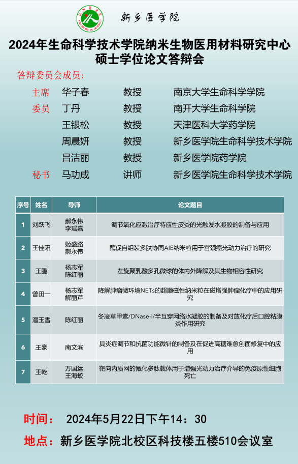 2024年春季华亿在线手机版(大中国区)生命科学技术学院纳米生物医用材料研究中心硕士学位论文答辩会