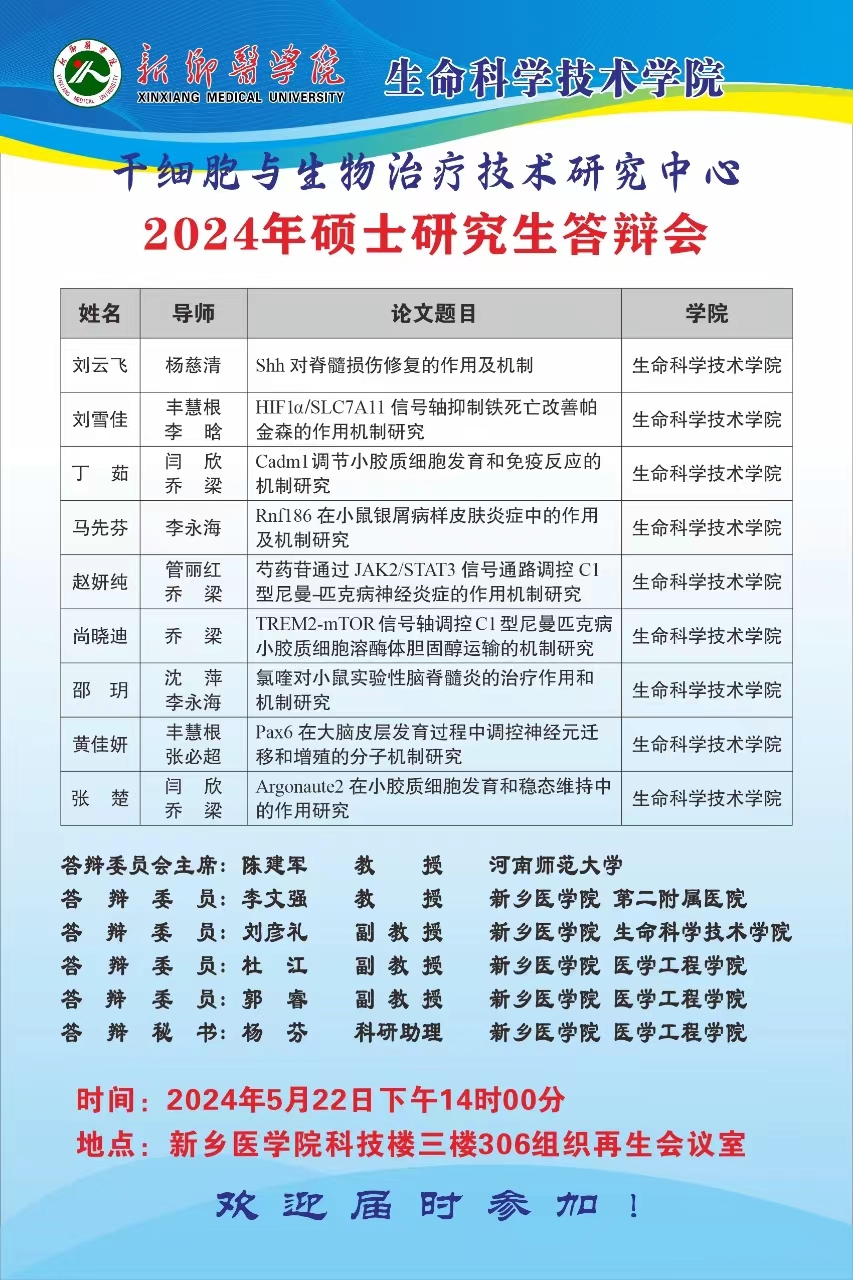 2024年春季华亿在线手机版(大中国区)生命科学技术学院干细胞与生物治疗技术研究中心硕士学位论文答辩会