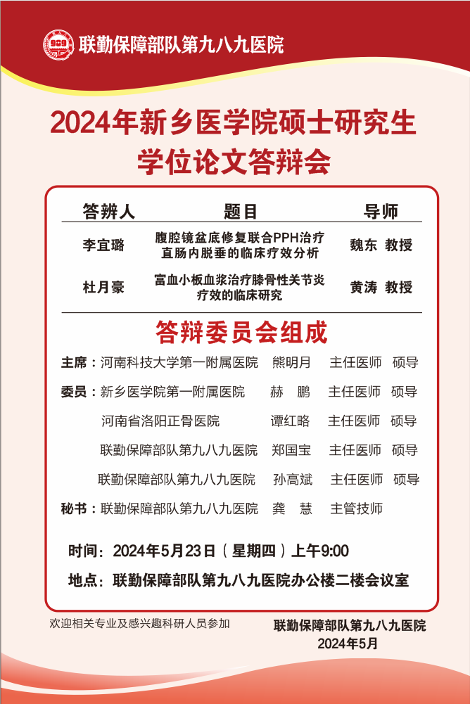 2024年春季华亿在线手机版(大中国区)联勤保障部队第九八九医院硕士学位论文答辩会