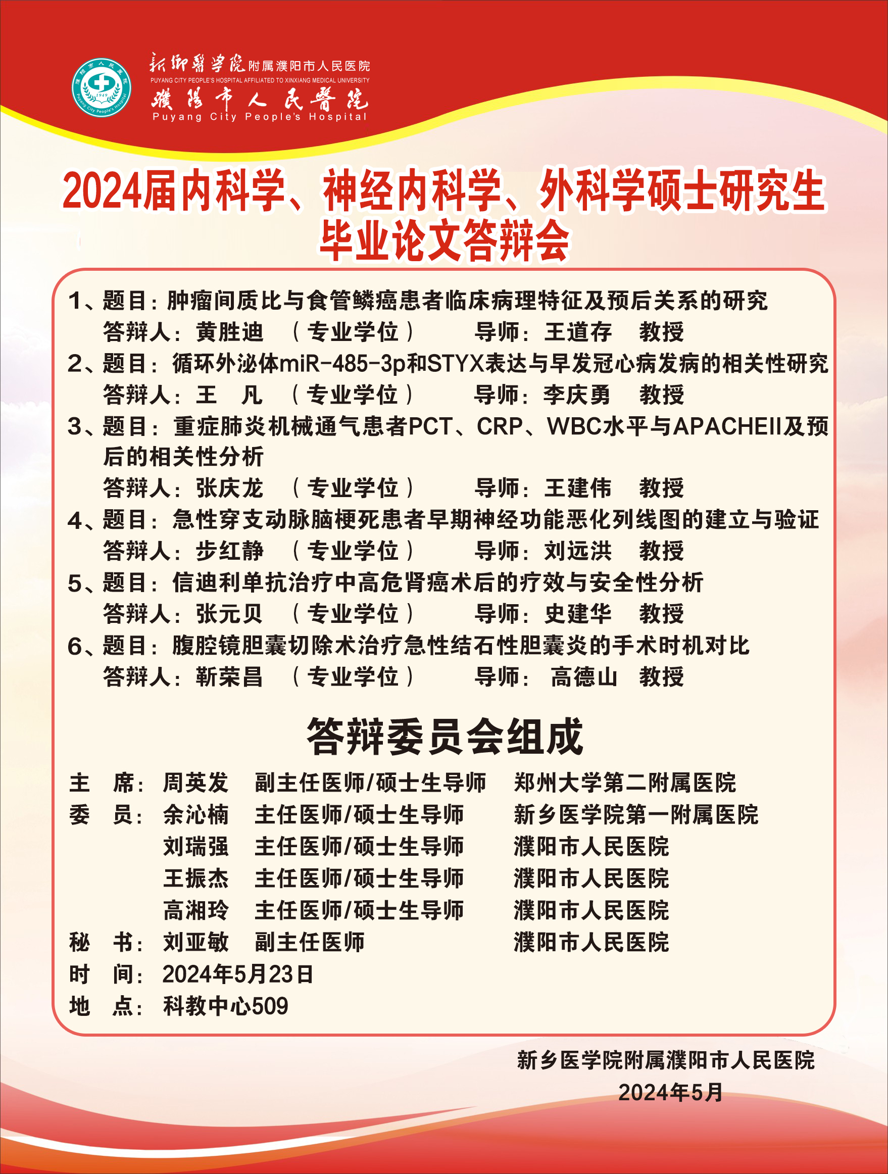 2024年春季华亿在线手机版(大中国区)濮阳市人民医院硕士学位论文答辩会