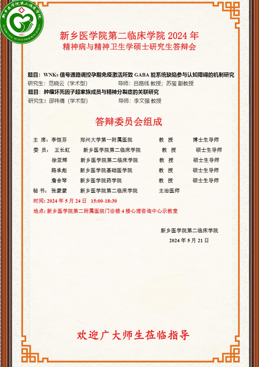 2024年春季华亿在线手机版(大中国区)第二临床学院精神病与精神卫生学硕士学位论文答辩会