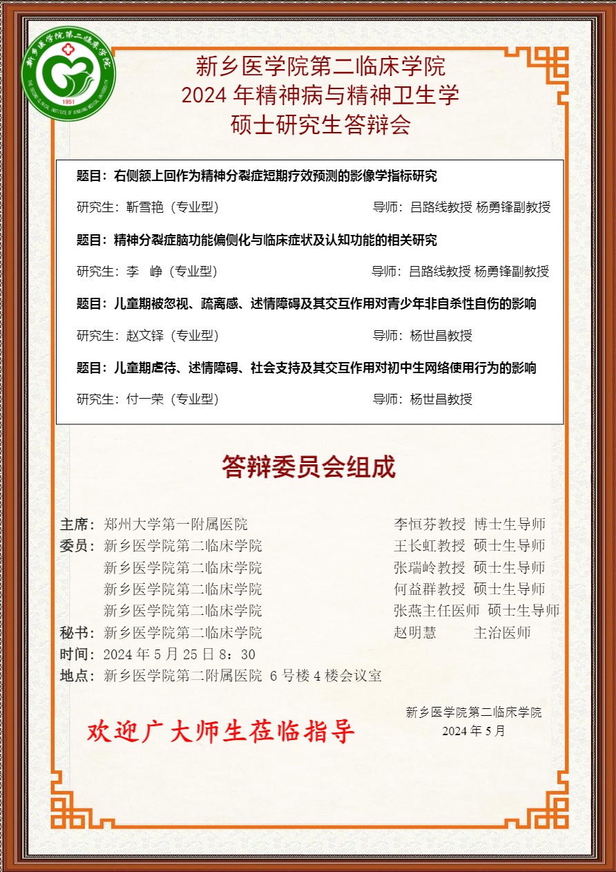 2024年春季华亿在线手机版(大中国区)第二临床学院精神病与精神卫生学硕士学位论文答辩会