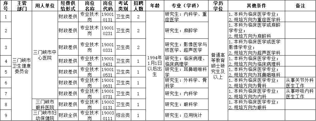 按照《省人社厅关于印发<河南省事业单位公开招聘工作规程>的通知》(豫人社〔2015〕55号)和《关于统筹安排全省事业单位公开招聘联考工作的通知》(豫人社函〔2023〕289号)等有关规定,根据工作需要,2024年三门峡市中心医院公开招聘岗位9个,招聘人数12名。