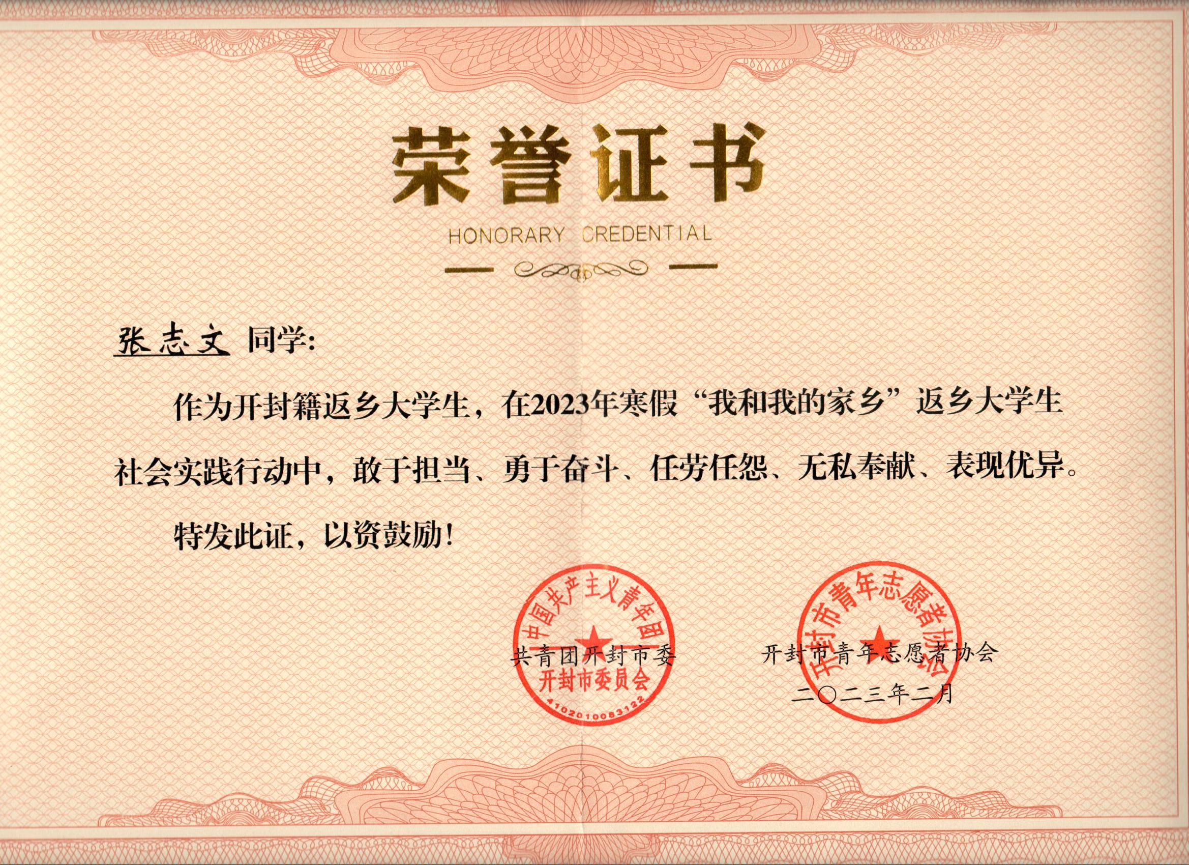 我校第三临床学院2022级研究生张志文积极响应当地号召,参加开封市2023年寒假“我和我的家乡”返乡大学生社会实践活动,投身当地基层机关一线,服务人民群众。在活动期间,张志文敢于担当、勇于奋斗、任劳任怨、无私奉献、表现优异,被共青团开封市委、开封市青年志愿者协会联名表扬。
