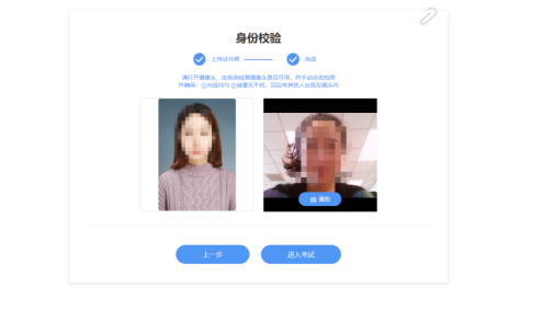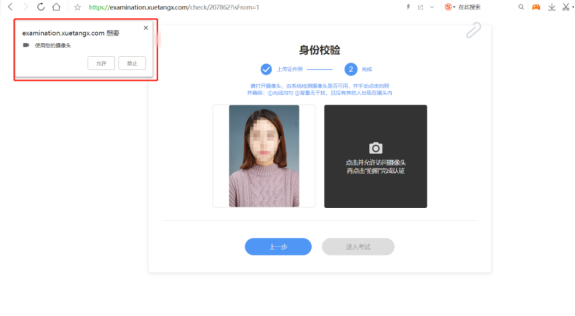 7.点击右侧对话框,允许访问摄像头,点击拍照完成认证,点击进入考试。