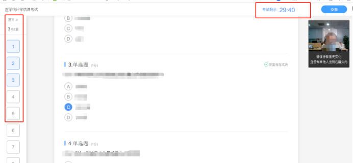 9.进入考试后,开始倒计时,右上角为考试剩余时间,左侧题号变蓝,为作答题目,白色为未作答,考试期间摄像头一直保持开启状态。