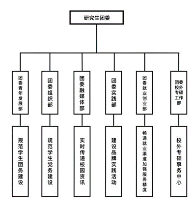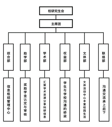 各分会组织机构设置:参照校研究生会部门设置,具体设置情况结合分会实际情况决定。分会主席团不超过3人,可设置执行主席和轮值主席;分会工作部门不超过6个,综合部、助学部、联络部为必设部门,其余部门根据分会具体工作设置;在人员配额上,分会总人数不超过30人;在组织管理上,各研究生分会由校研究生会直接指导。