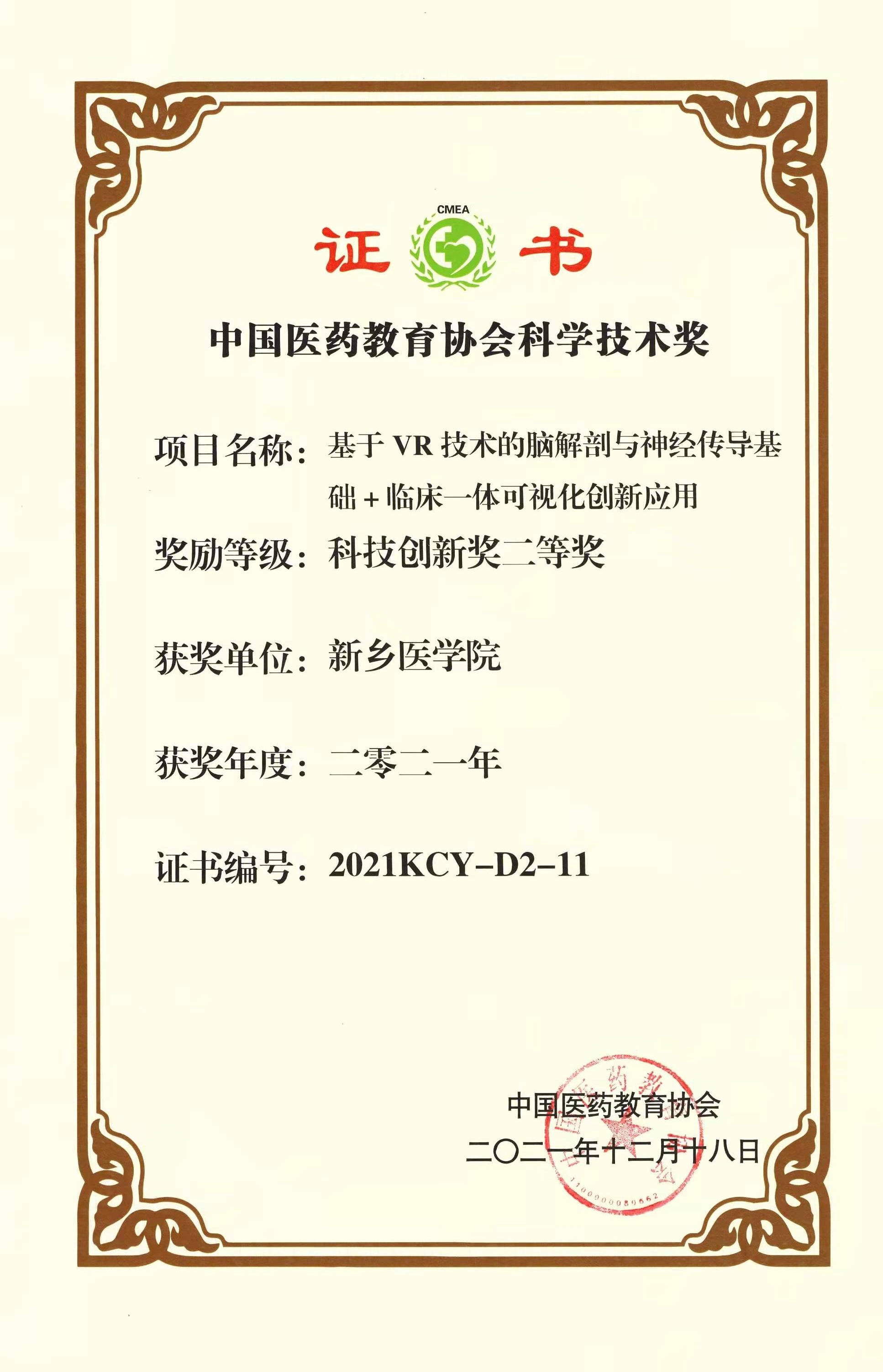12月25日,中国医药教育协会第五次会员代表大会暨中国医药教育大会在北京顺利举办(线上线下),我校副校长王辉、科技处副处长刘巍线上参加大会,会上正式宣布2021年度中国医药教育协会科学技术奖结果,我校赵俊强、于毅、陶晶、赵宗亚、任武、王玉峰等10名老师和1名研究生的创新研究成果《基于VR技术的脑解剖与神经传导基础+临床一体可视化创新应用》经过严格评审,函审和终审(答辩)程序,经过评审委员会和指导委员会审核同意,获得中国医药教育协会科学技术奖科技创新二等奖,为我校在该科学技术奖科技创新类的获得的最高奖项。该成果在VR大脑可视化结构原创基础上,全国首例虚拟重构标准化神经核团,结合神经外科三维重建临床一体化设计,实现功能可视化;成果推广可进一步服务于基础神经解剖,神经电信号传导模拟,神经内科及精神辅助诊断、脑外科手术规划与康复培训等领域。已获授权国家发明专利与计算机软件著作多项。