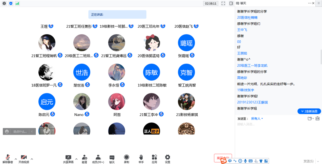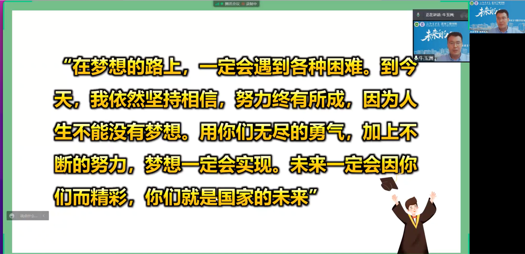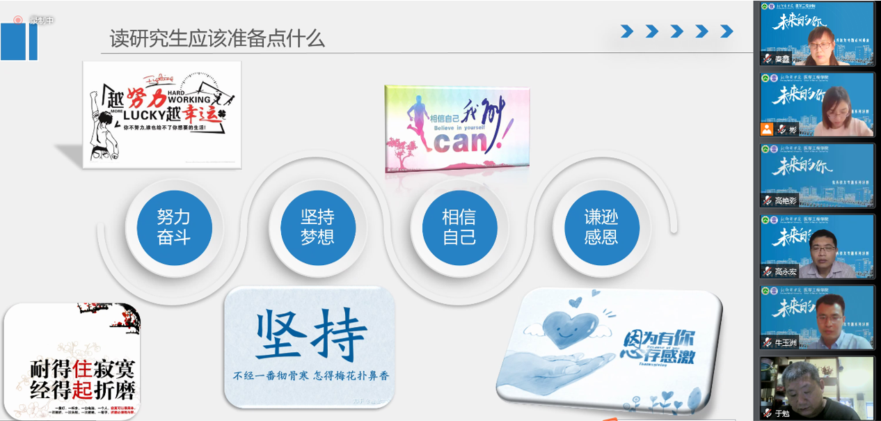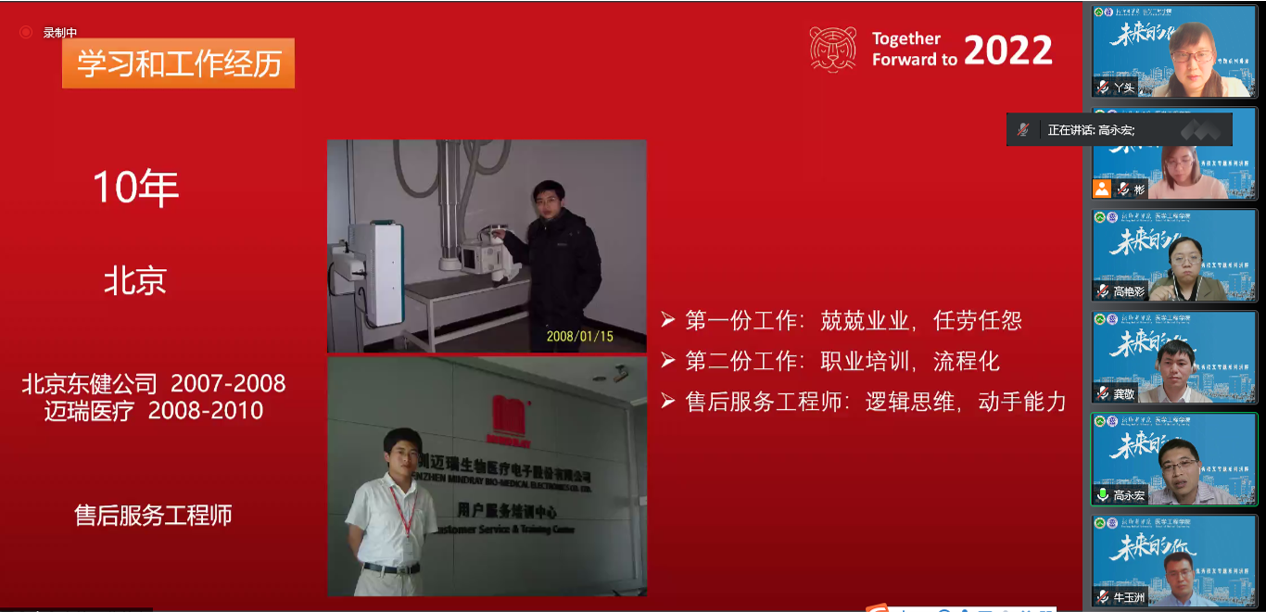 5月8日,我院“未来的你”优秀校友系列讲座首场报告在云端会场如期举行,我院优秀校友高永宏、高艳彩、牛玉洲、龚敬与在校师生共话成长。学院领导班子成员、辅导员、班主任及500余名师生在线参加活动,讲座由生物医学工程系主任秦鑫主持。