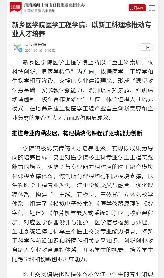 近日,今日头条、大河健康网、顶端新闻等平台纷纷报道我院近年在新工科理念指引下进行专业人才培养上取得的成效。媒体的关注与报道,不仅是对我院人才培养工作的高度肯定,更是对新工科理念在高等教育界巨大影响的有力见证,也为学院持续开展教育改革与创新注入了新的活力。