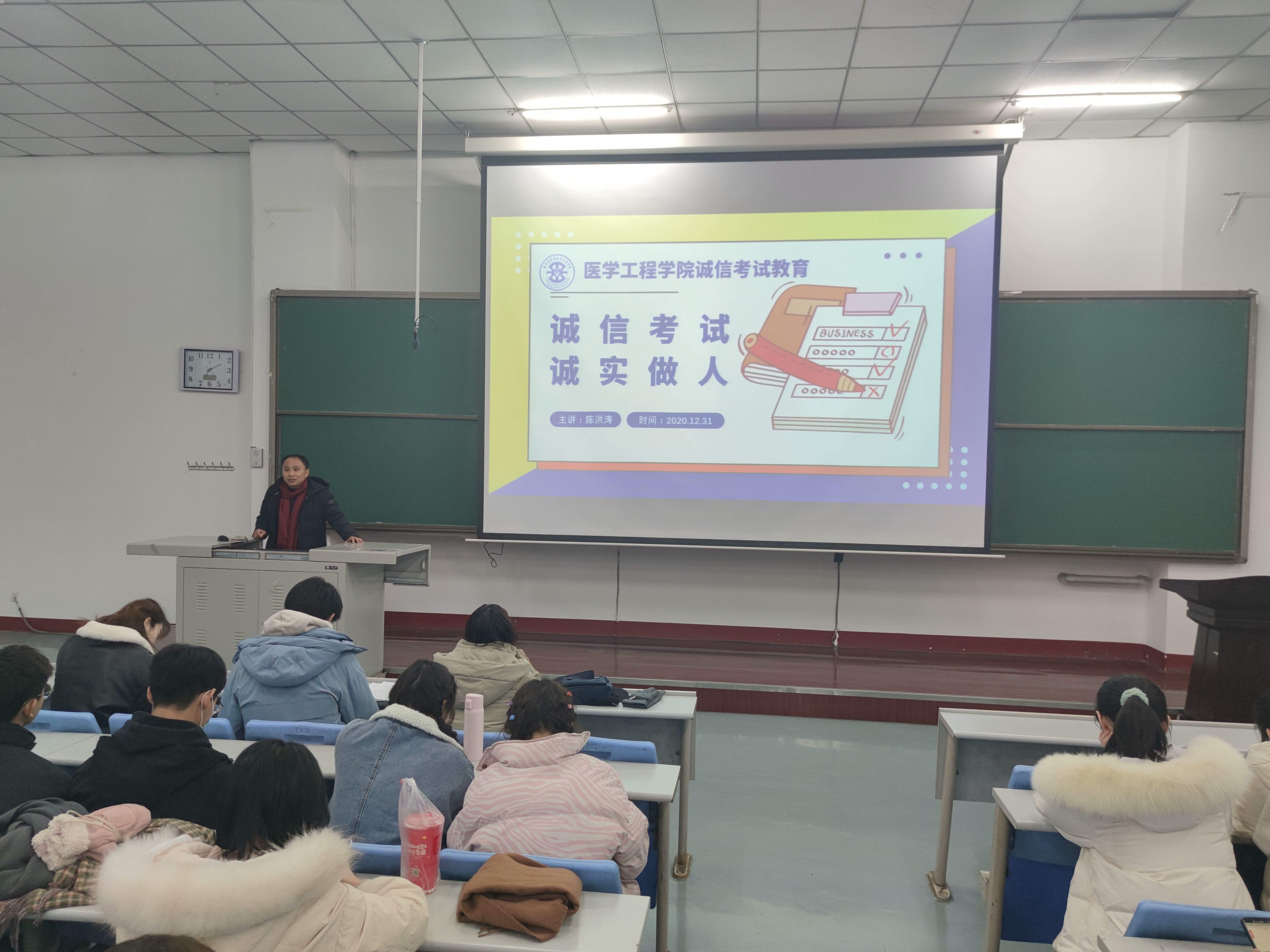 (文/邓兆年)为加强学院学风建设,严肃学生考风考纪。12月31日晚7点。我院于三教D2教室举行诚信考试教育大会。医学工程学院团委书记陈洪涛担任主讲,辅导员范亚桢及我院全体学生参加会议。