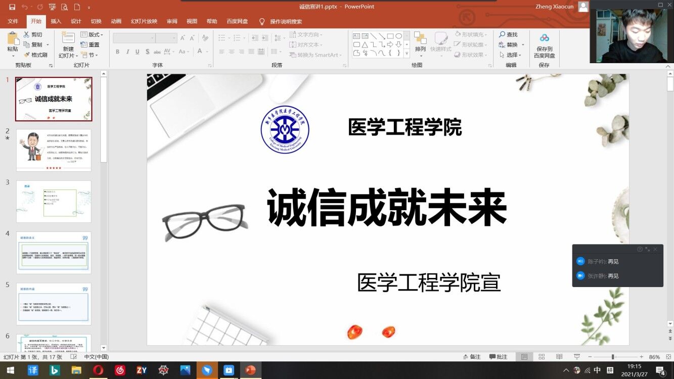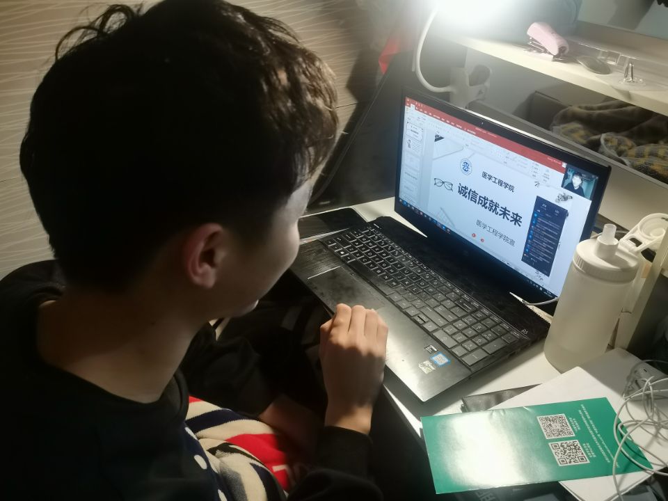 为进一步加强大学生诚信教育,提升大学生诚实守信意识,营造诚信、成才、奋进的校园文化氛围,我院于3月27日晚7点以钉钉群直播的形式开展以“诚信成就未来”为主题的诚信教育大会。医学工程学院团委书记陈洪涛和辅导员范亚桢出席会议,由信贷部干事王岩担任主讲,我院大一至大三全体学生参加会议。