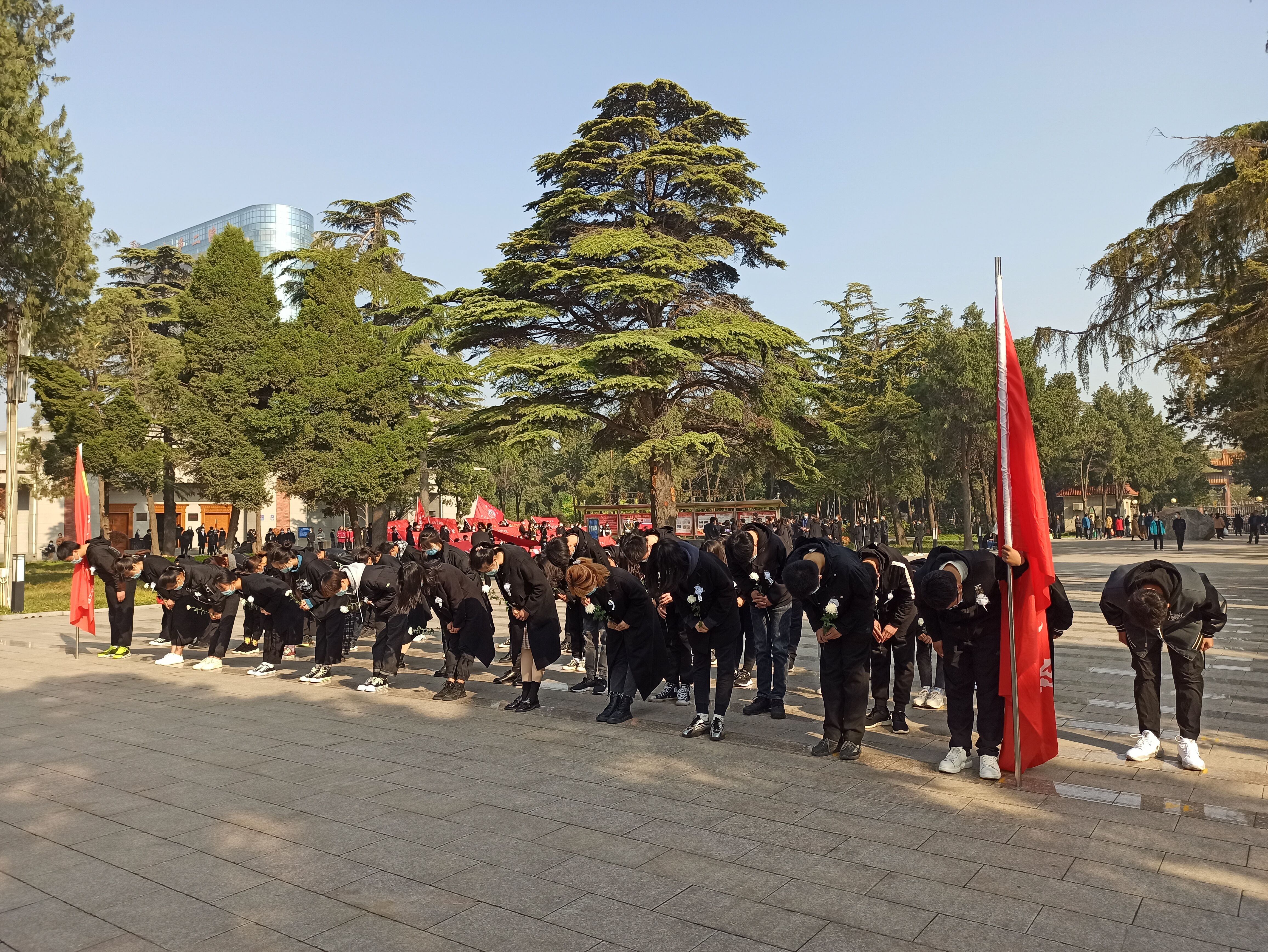 缅怀先烈,寄托哀思。全体师生代表在烈士公墓前举行哀悼仪式,由学生代表高雪主持仪式流程。在庄严的革命烈士纪念碑之后,安息着一排排为革命事业献身的烈士,全体师生代表伫立在烈士墓前,思绪万千,在主持引领下集体向革命烈士们默哀三分钟。紧接着,陈洪涛带领全体师生代表宣读入党誓词,革命先烈为人民利益而死,将自己的热血洒在祖国大地上,后辈们将为共产主义奋斗终身,随时准备为党和人民牺牲一切,永不叛党!