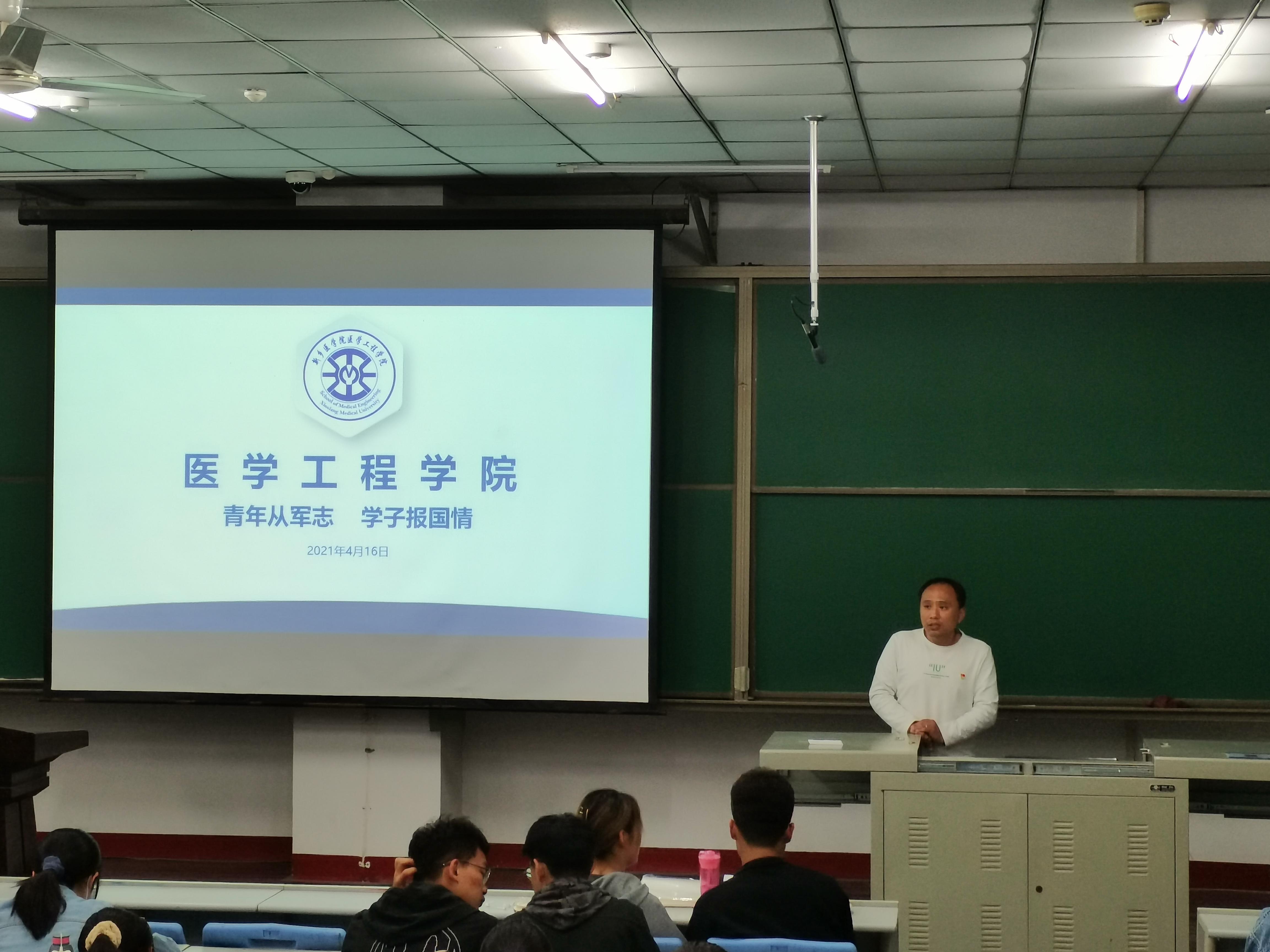 为加强征兵政策宣传,鼓励学生积极参与应征入伍。4月16日晚七点我院在3203教室举办“青年从军志,学子报国情”征兵宣讲活动。医学工程学院团委书记陈洪涛宣讲,医学工程学院全体学生参加。
