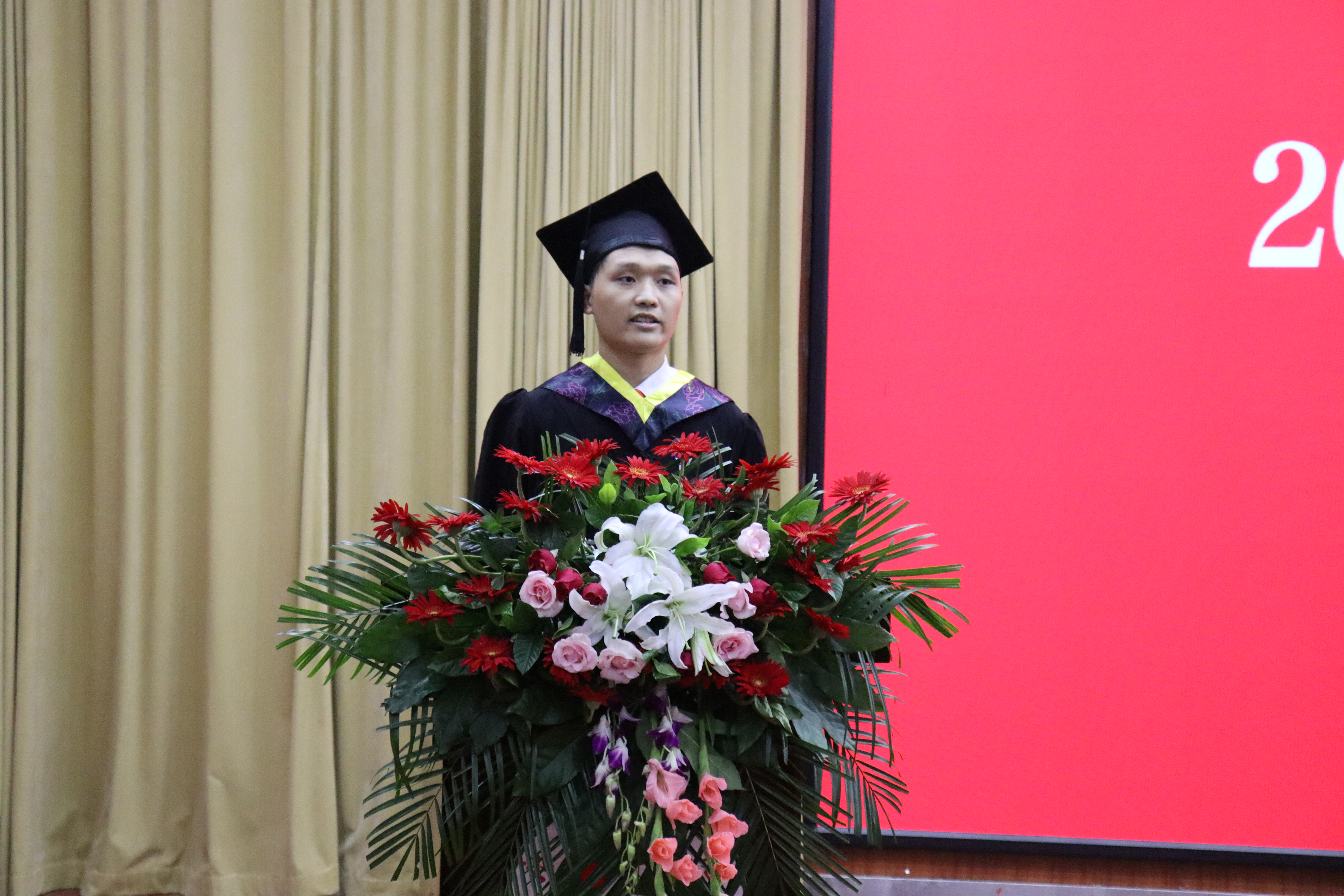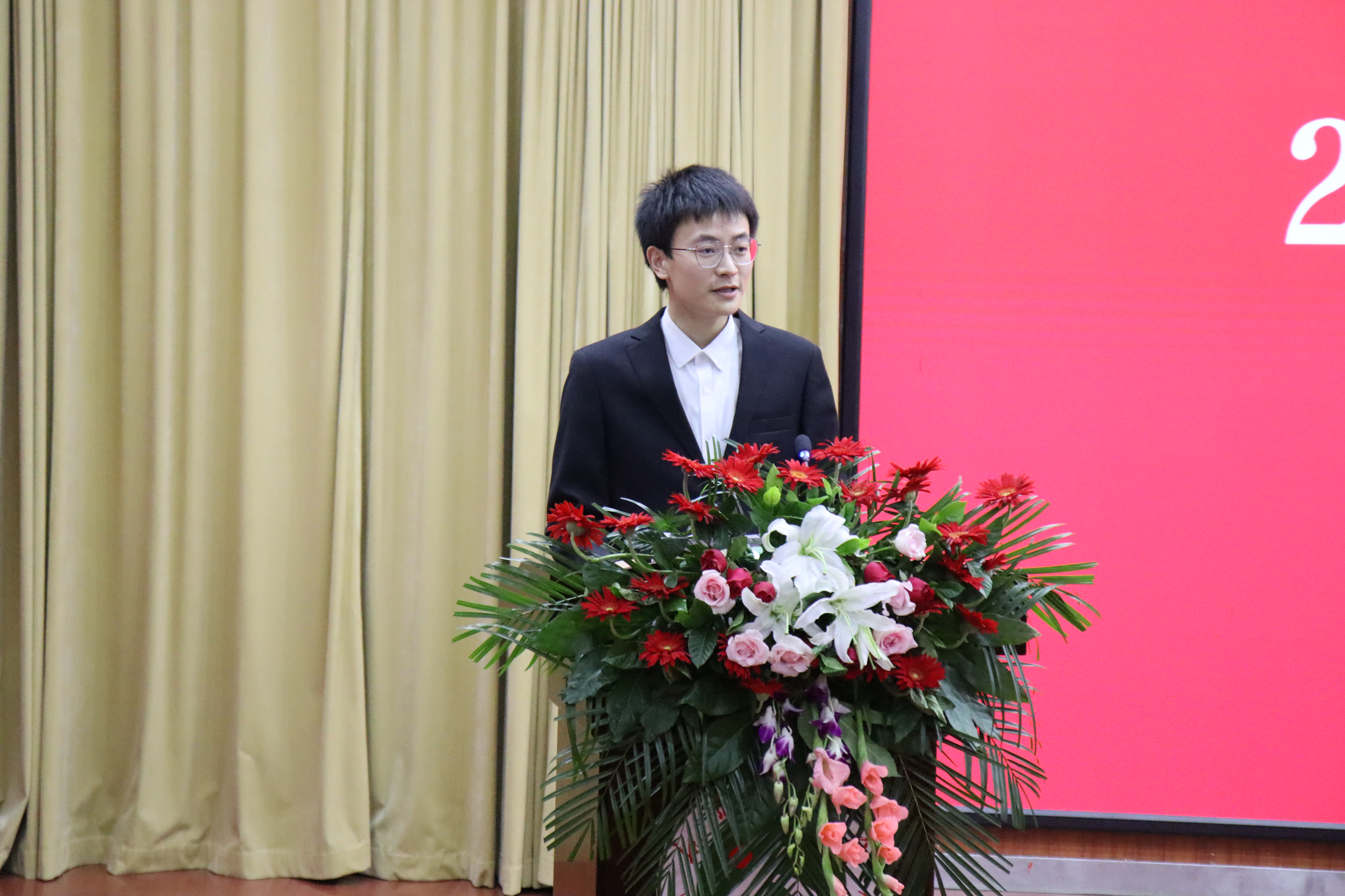 2018级学生王子丹作为在校生代表发言。他对顺利毕业的学长学姐表示祝贺,祝愿学长学姐们前程似锦。他讲述了学长学姐们在校间的身影—有人在实验室里潜心科研,有人在田径场上挥汗如雨,有人在图书馆奋笔疾书……他表示必将追随学长学姐们的脚步,勇敢逐梦。