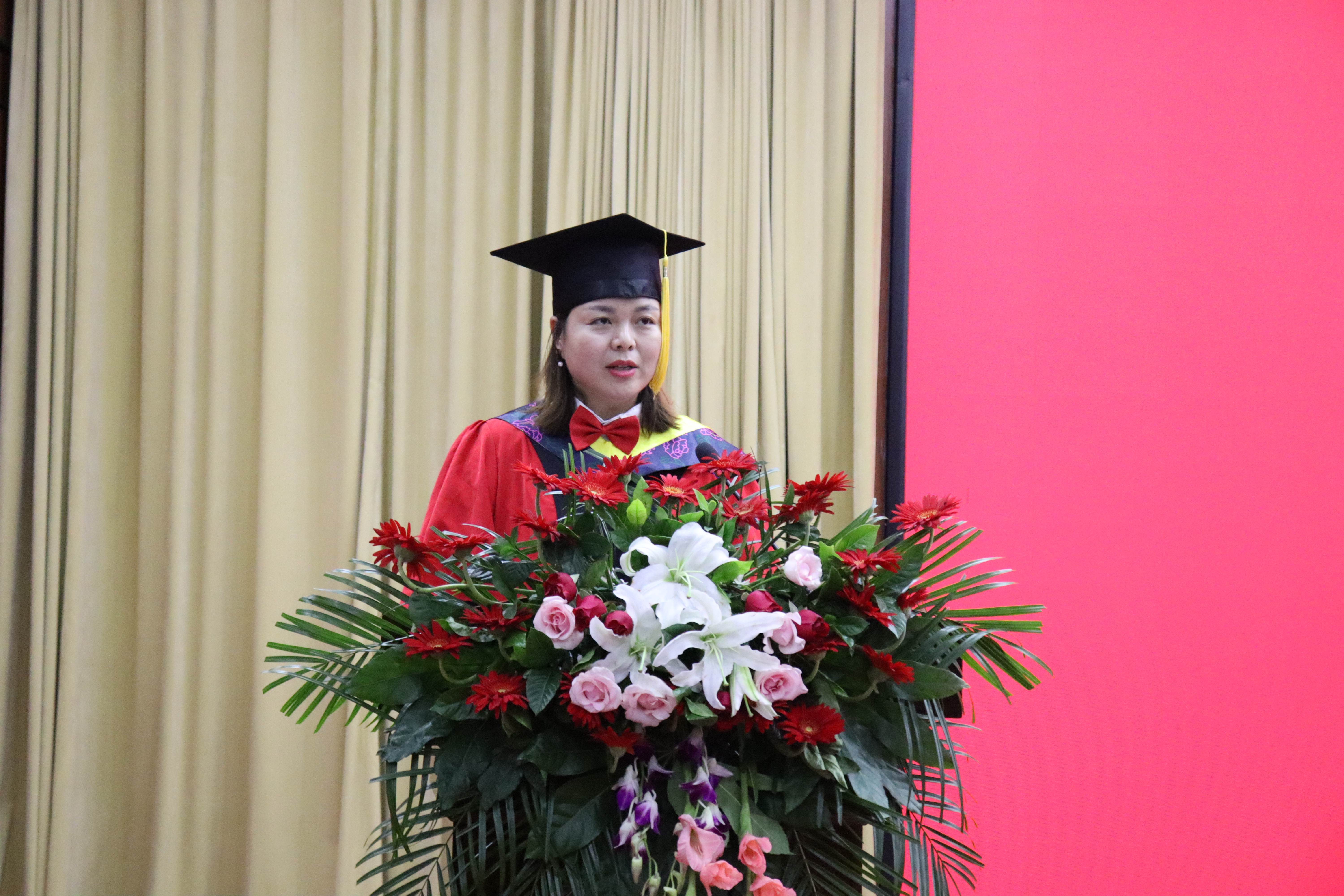 教师代表刘燕发言。她告诫同学们要学会善待自己,善待家人,善待朋友和同事。健康是最重要的财富, 要常做运动,拥有勇健的身体,将来才在工作上努力拼搏。嘱咐同学们毕业后要做到三爱:爱自己、爱生活、爱家人。她祝愿毕业生在新的岗位,新的环境中能够不断进步,取得更大的成就。最后,他提醒同学们:“要常回家看看”