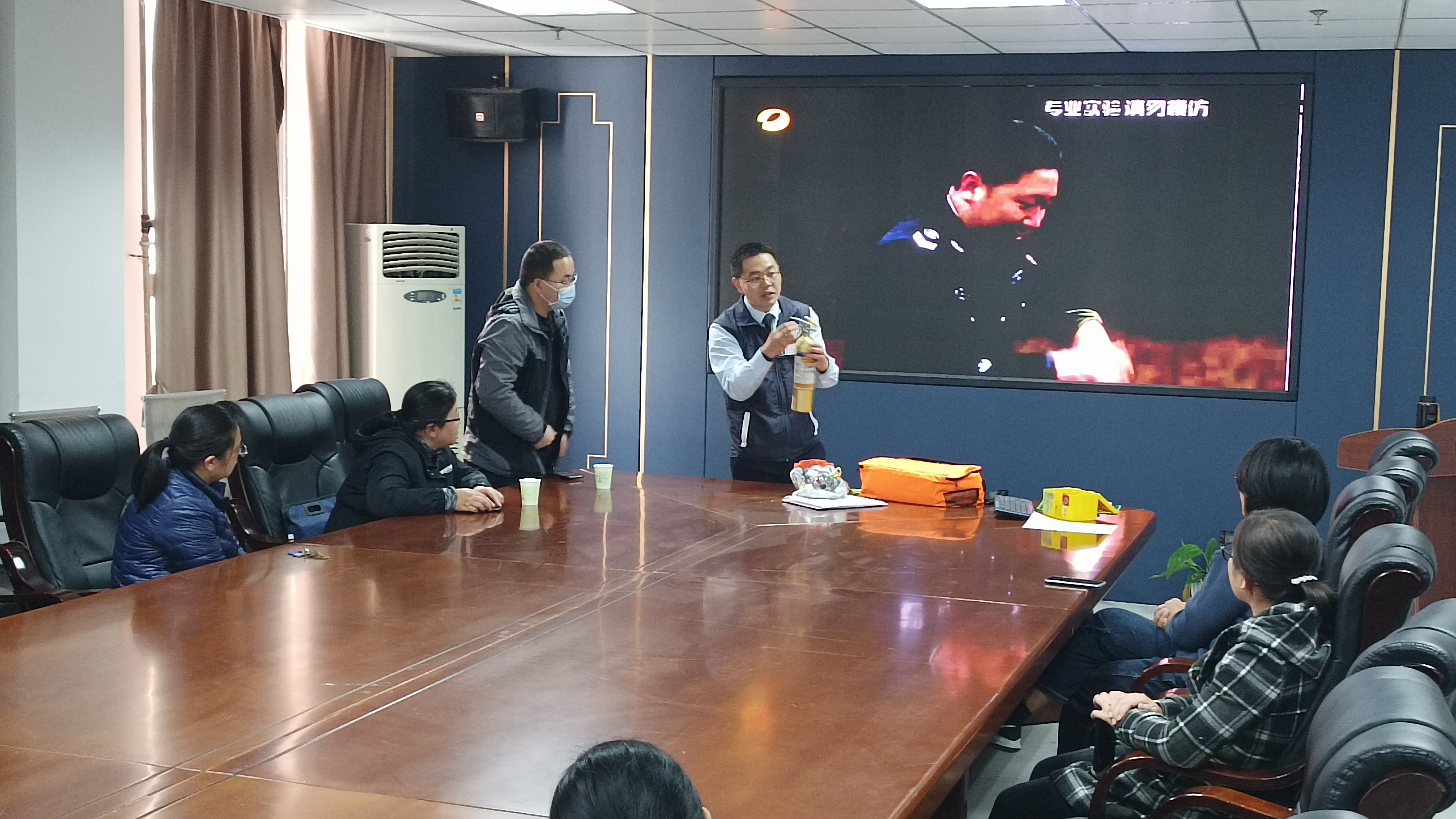 在老师和同学们陆续就座后,杜主任首先讲述了本次会议讲解的大致内容,包括消防案例、消防安全知识以及消防安全防护用具等相关内容。在消防案例的讲解中,杜主任分别讲述了我市近几年所发生的几起消防安全事故,与此同时,杜主任还穿插了许多有关消防安全的知识,使在座的老师和同学们深刻体会到了消防安全的重要性。其后,杜主任将携带的消防器材拿上讲台,其中包括灭火毯、液基灭火器、灭火宝、防毒防烟面具等消防器材,杜主任通过自己对消防器材的使用演示,生动形象地将器材的使用方法描述出来,各位老师和同学们一边认真观看杜主任的演示一边将消防器材的使用方法写在笔记本上。