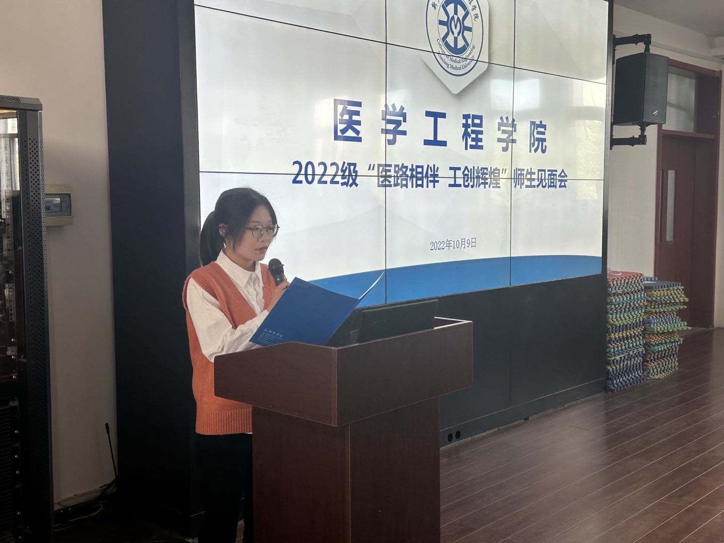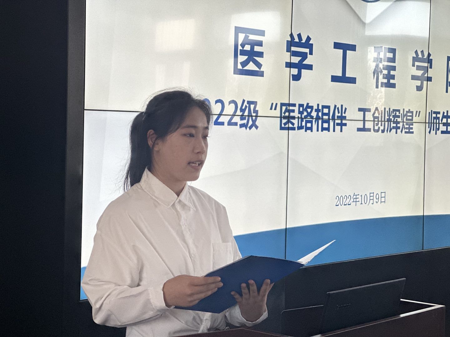 视频播放结束,会议进入第一项,我院团委轮值主席郭孟琦作为优秀学生代表发言。她祝贺新生们踏上勇敢追梦之旅,指出新生们要循着新医学子的历史脚印,秉持“医工融通,精诚致用”的院训,争做后浪青年,不要放飞自我,产生惰性,应直面布满荆棘的医学之路,手持笔墨,书写“医工精神”的新篇章。