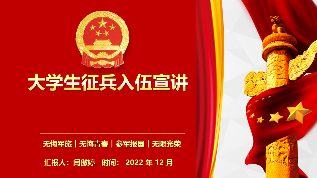 青春无限好,参军正当时。为激发大学生参军报国的光荣感和使命感,点燃投身军营的青春热情,为后续征兵工作奠定良好的基础,我院1227日晚上七点以钉钉直播的形式开展了此次3月份春季征兵宣讲活动。本次宣讲活动由我校大学生入伍宣讲团成员闫傲婷主持,我院团委书记陈洪涛、辅导员范亚桢以及2022级全体学生参加。