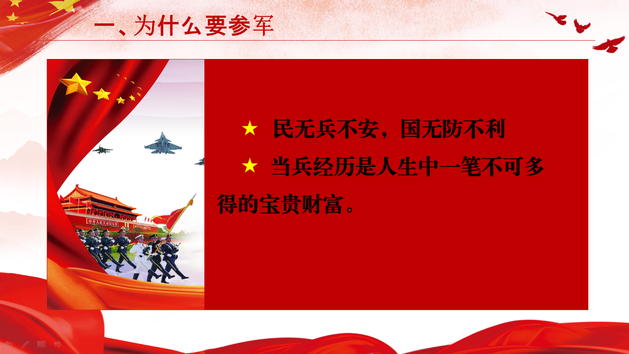宣讲中闫傲婷通过播放宣传片,展现了参加军队后生活的丰富多彩,满足了我院学生对参军生活的好奇心,充分调动了学生报名应征的积极性。接着,活动又介绍了关于3月份征兵的报名时间、报名方式、体检标准、优待政策等相关事宜,帮助我院学生细致地了解到征兵的各项事务。闫傲婷提到,携笔从戎,建功立业,维护国家安全、统一和稳定,是我国最高利益所在,也是构建和谐社会的重要前提。军队作为保卫和建设国家的一支重要力量,在构建社会主义和谐社会中肩负着重要责任。党和国家为我们创造了今天的幸福,我们就要用我们的力量为祖国明天的发展和安全作出贡献,积极参军,保家卫国。