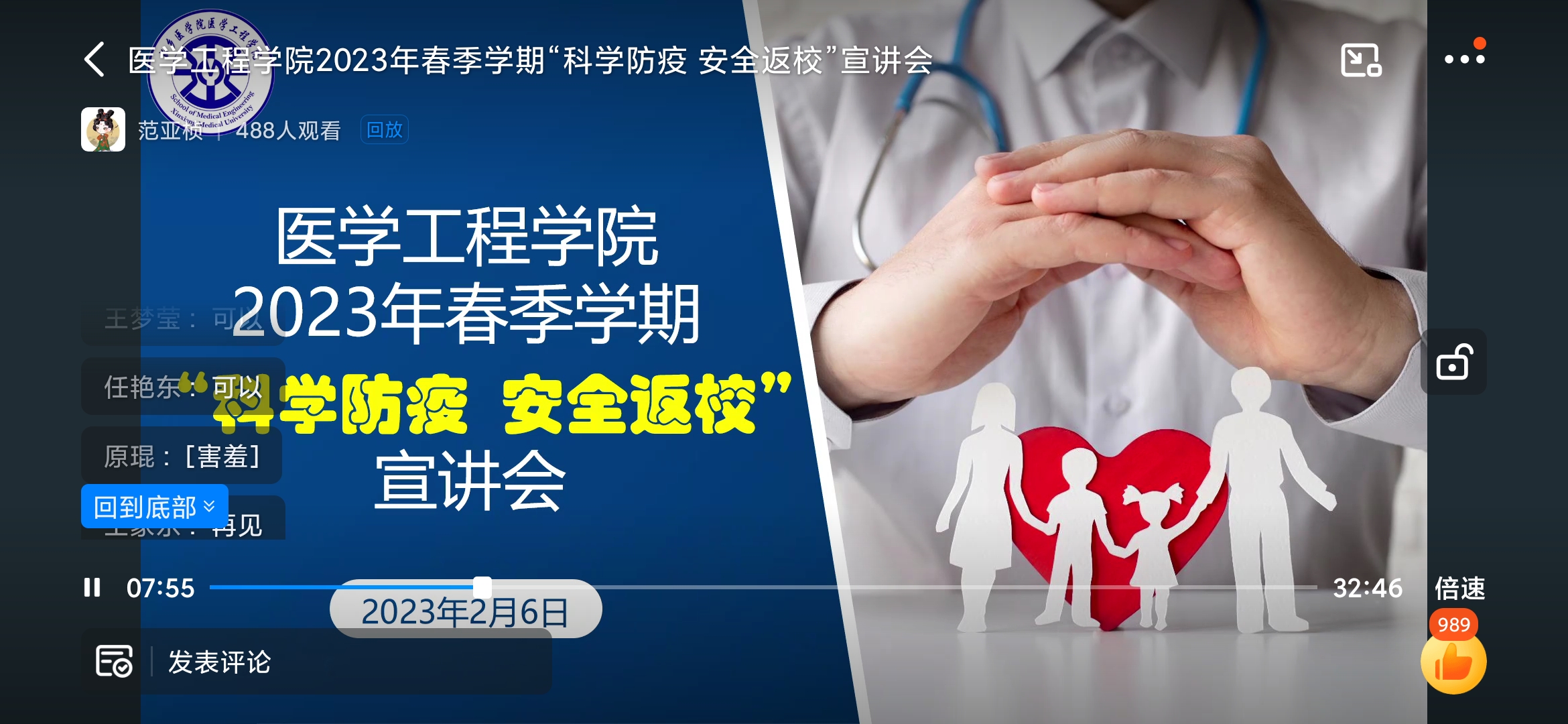 为加强疫情防控政策宣传、健康教育,保证学生安全返校,2月6日下午五点,我院于医工钉钉群开展2023年春季学期“科学防疫 安全返校”宣讲会。此次会议由团委书记陈洪涛、辅导员范亚桢主持,医学工程学院全体学生参与。
