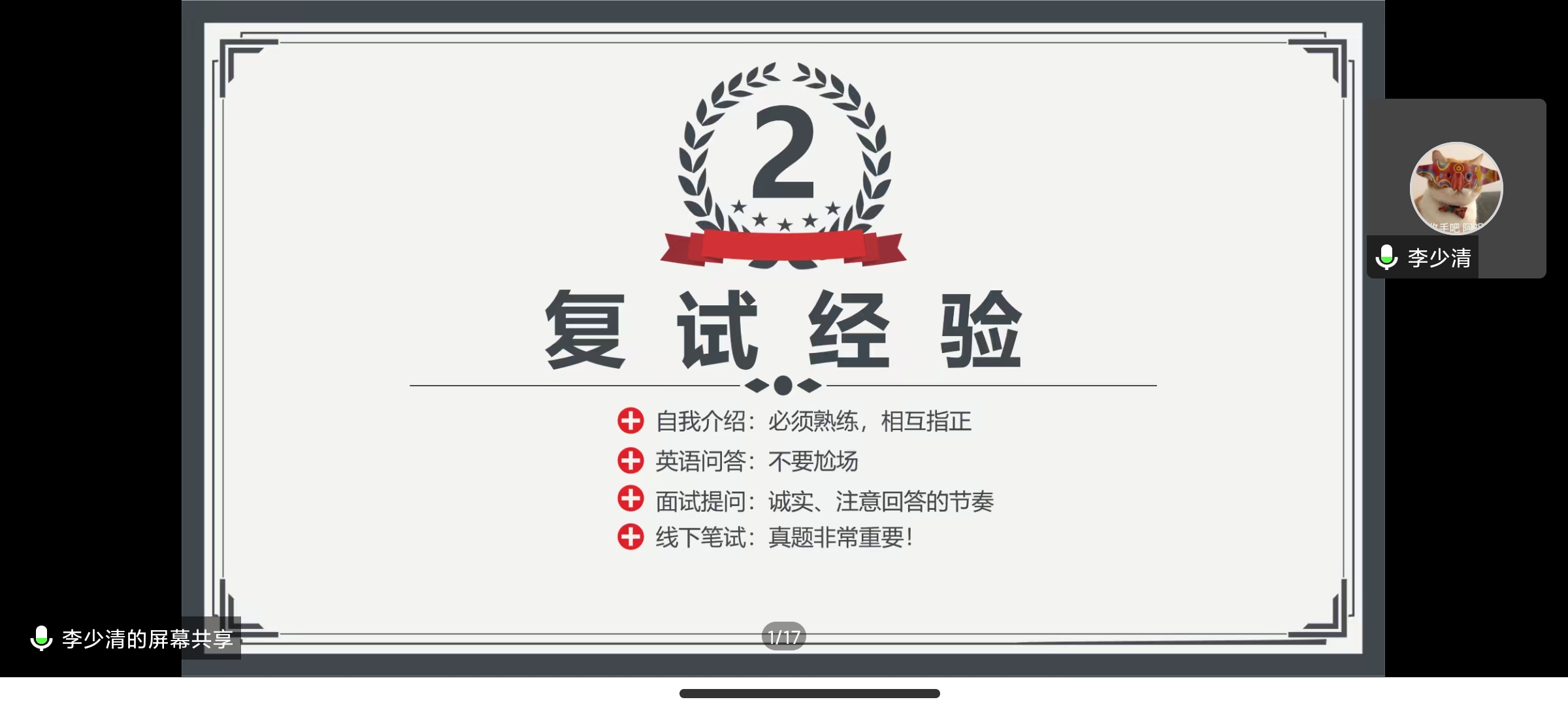 本次分享会成功地帮助考研学子了解到很多关于复试的应对技巧,加强了同学们圆满复试的信心。相信各位考研学子在复试中会更加顺利,并且能够取得满意的成绩,在未来披荆斩棘,前途似锦。(供稿:郑仙菊)