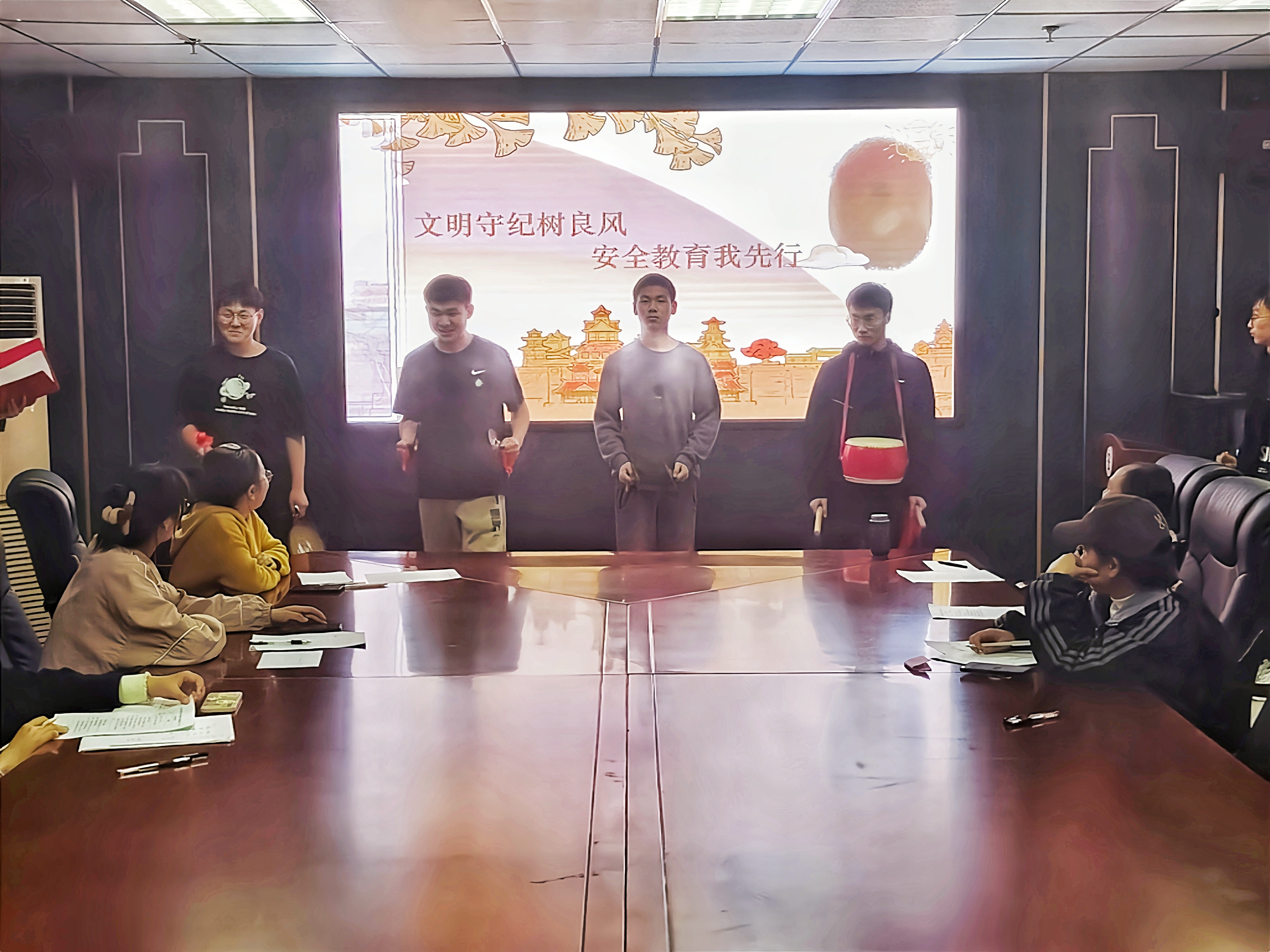 46日晚7时,我院于科技楼716举办“文明守纪树良风,安全教育我先行”节目表演大赛,本次比赛由团委书记陈洪涛、辅导员范亚桢、团委学生会主席团评审,亲友团到场鼓励选手。